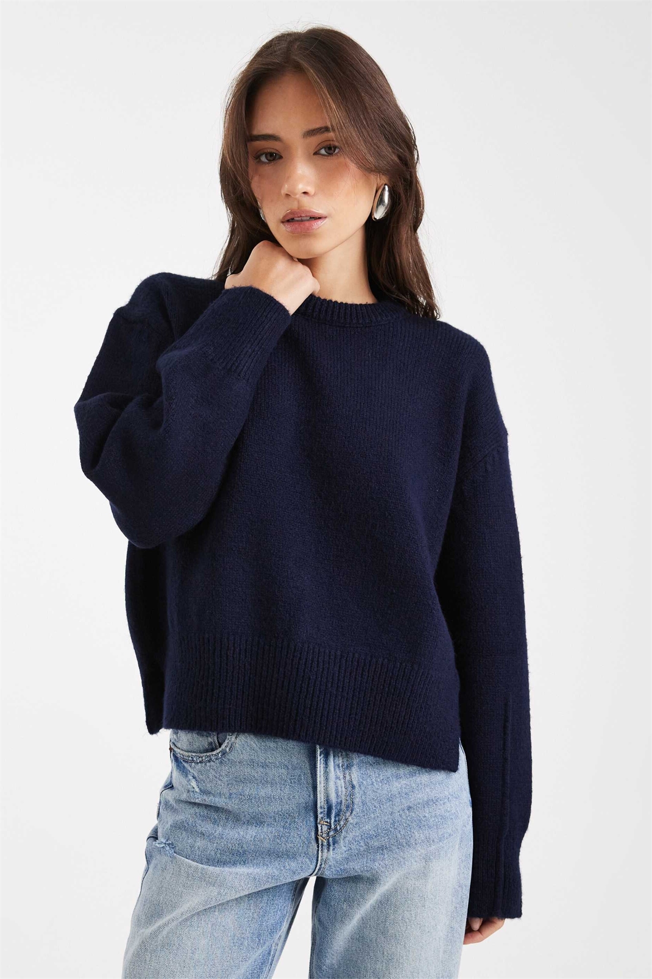 Свободный свитер с круглым вырезом и разрезами по бокам