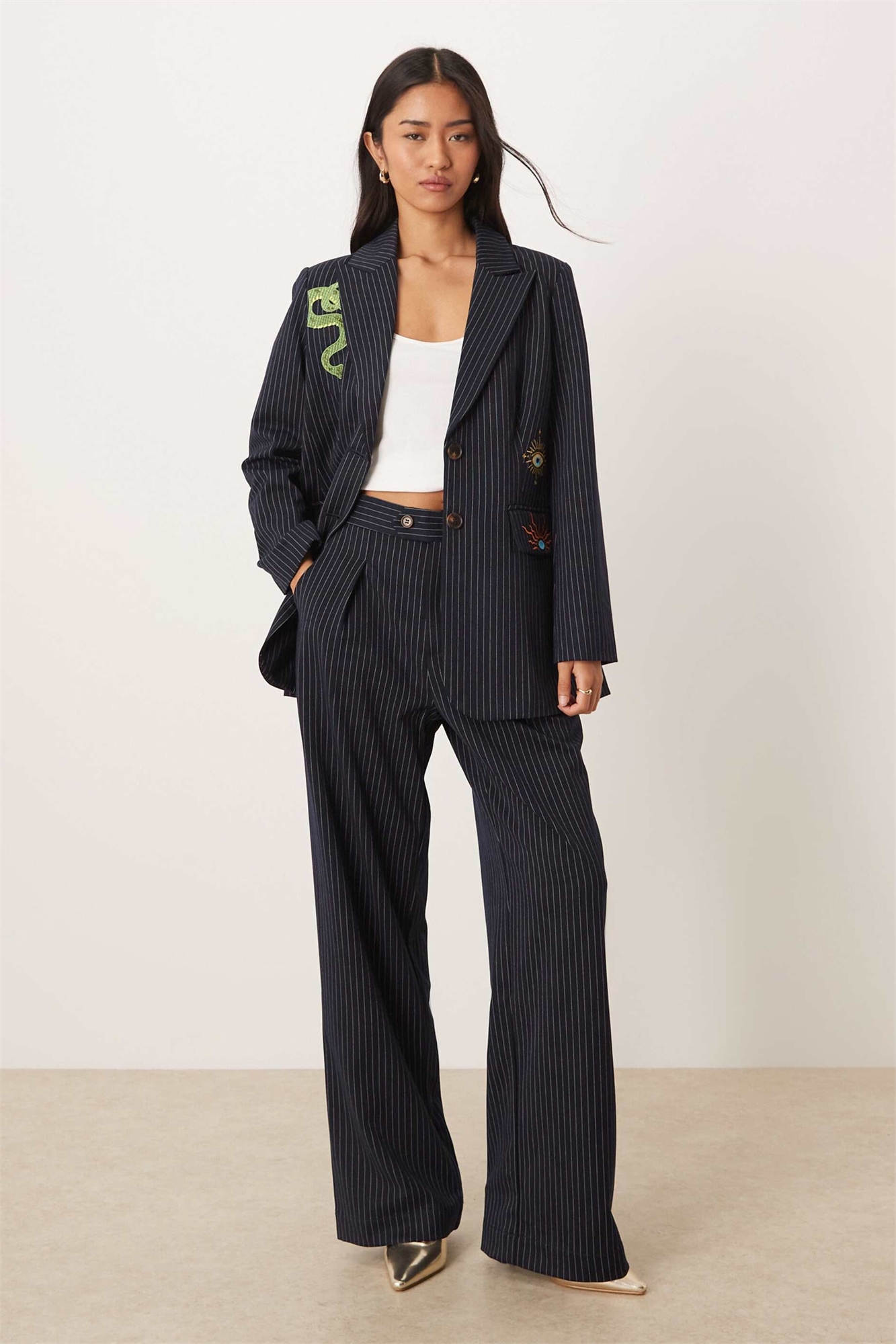 Широкие брюки с зауженными штанинами, темно-синие в тонкую полоску