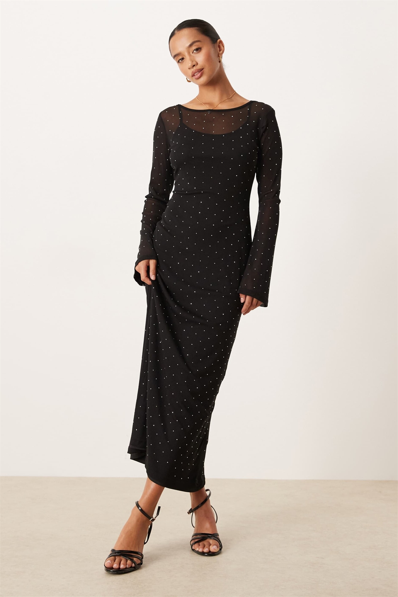 Платье средней длины с рукавами-колокольчиками из сетчатого материала с декоративными элементами