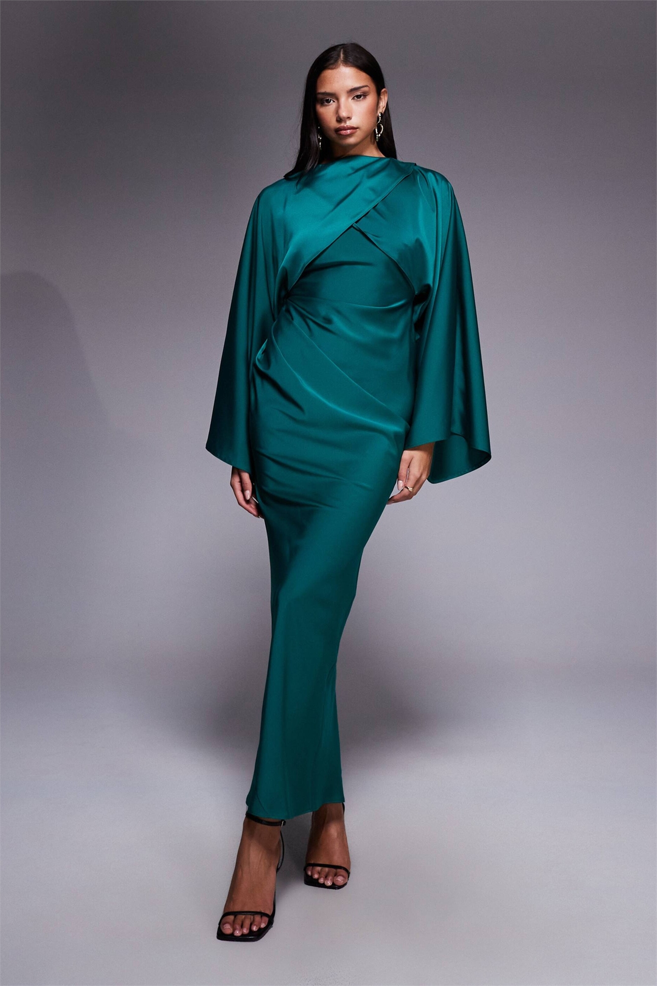 Макси-платье с косым кроем из атласа с «крыльями» спереди