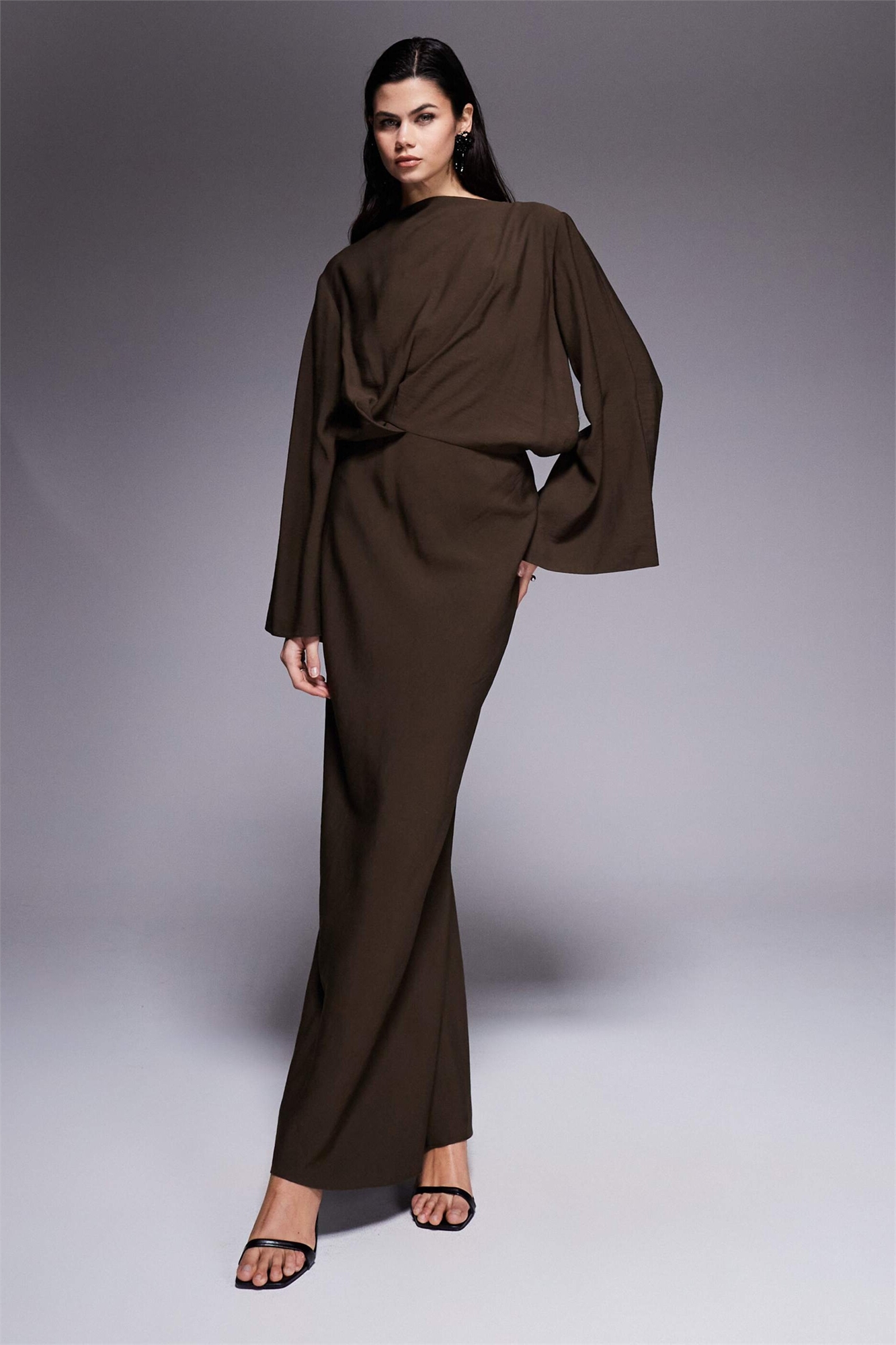 Макси-платье с длинными рукавами, заправленным в талию и косой кройкой