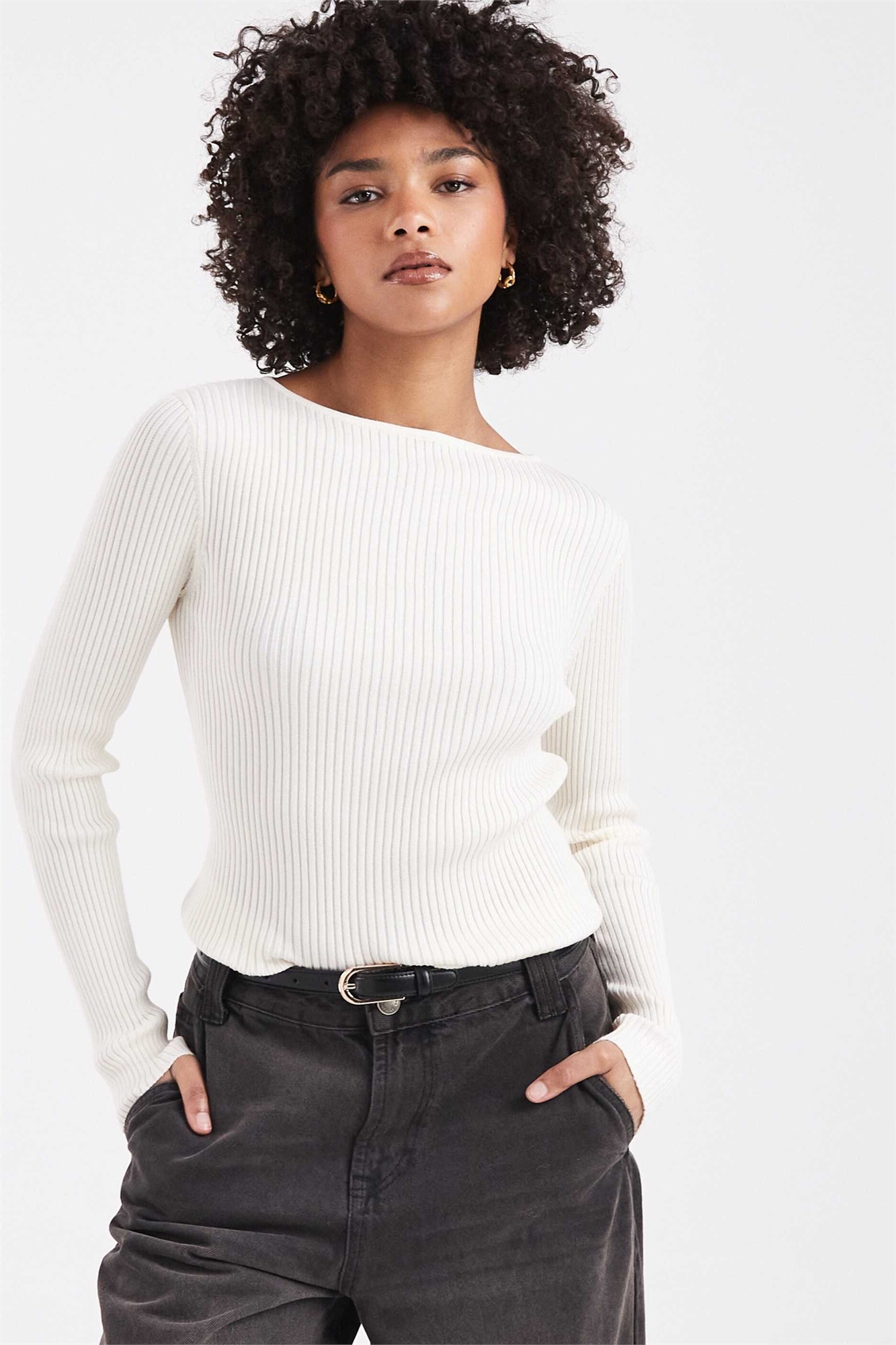 Свитер с ребристой отделкой, косым вырезом и длинными рукавами