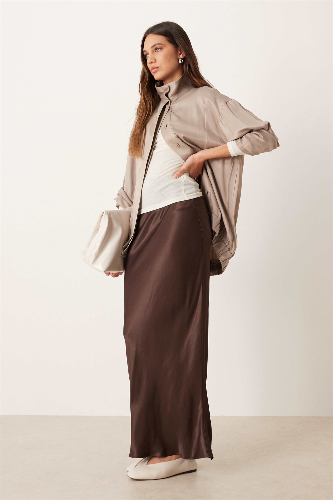 Макси-юбка из атласа с косой отрезкой