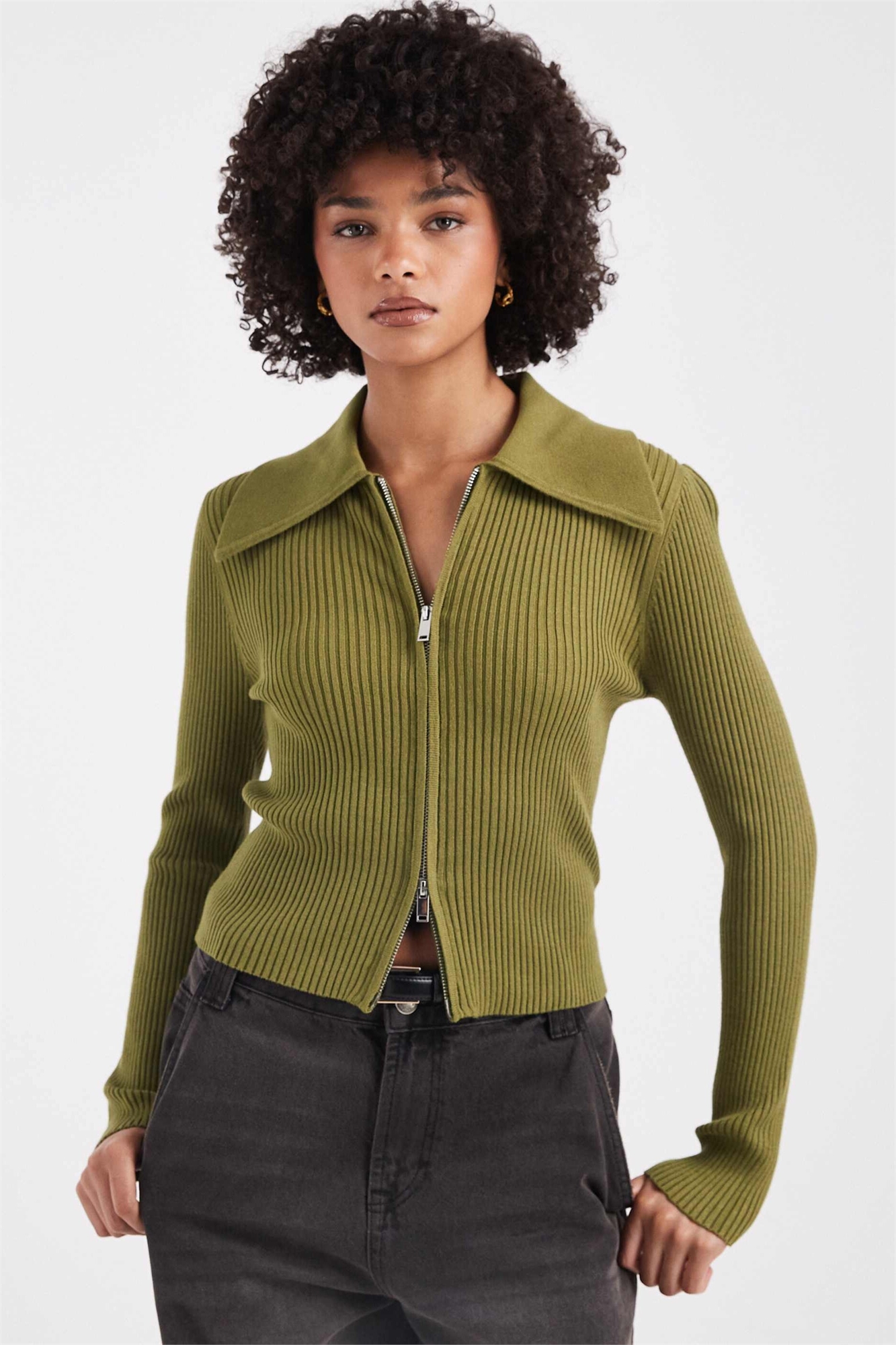 Кардиган с ребристой вязкой, воротником и застежкой-молнией