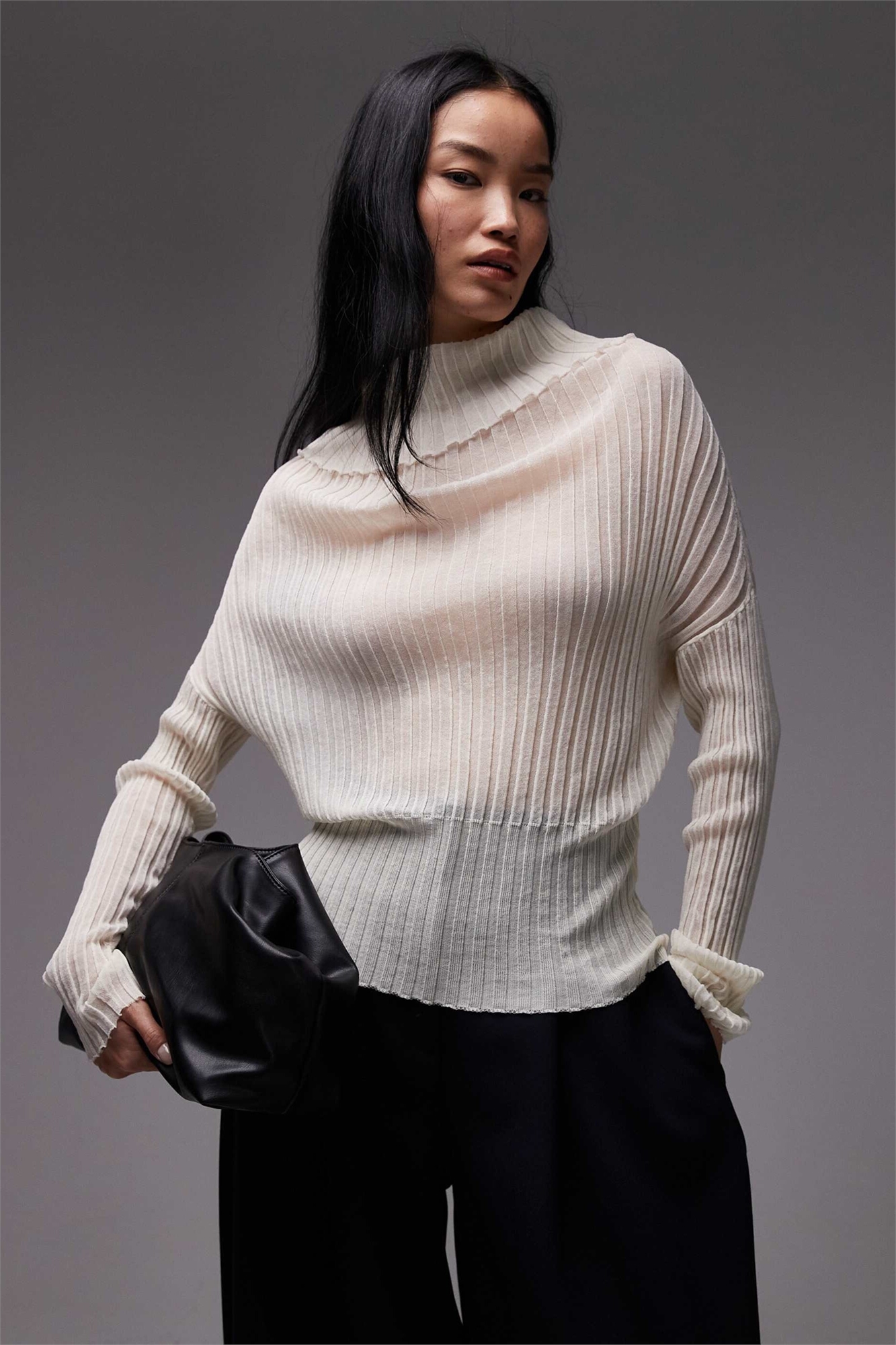 Тонкий и легкий свитер с широкой ребристой вязкой и высоким воротником