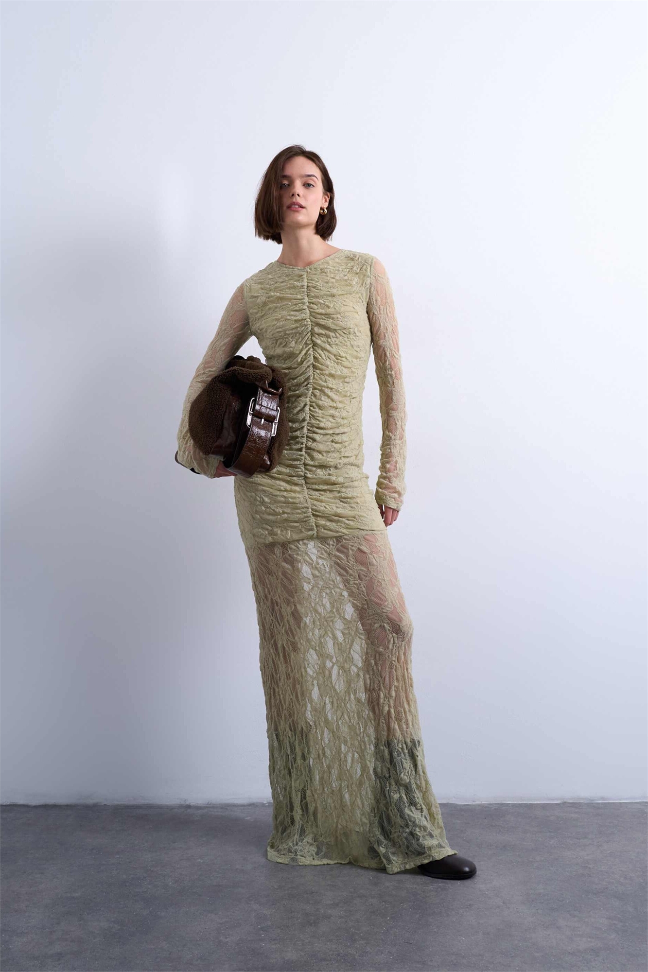 Макси-платье с кружевом, рюшами спереди и заниженной талией