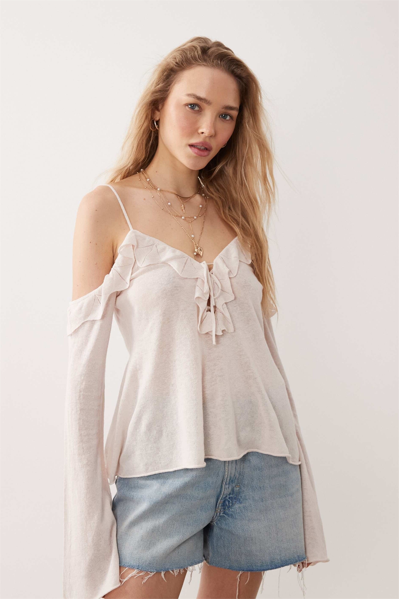 Топ из трикотажа премиум-класса с воланами и открытыми плечами из смешанного льна