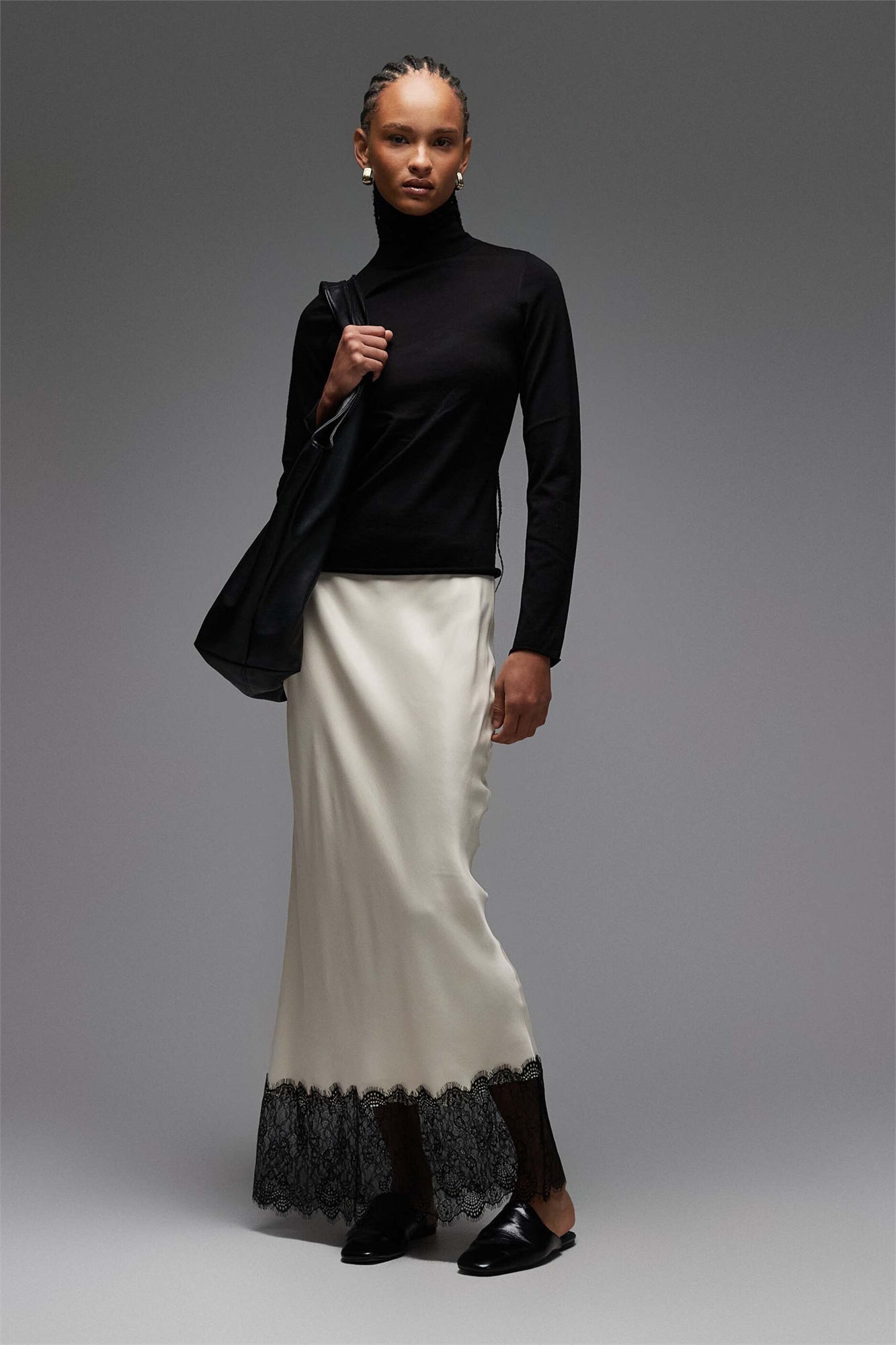 Юбка средней длины с косой отстрочкой из атласа и кружевной отделкой