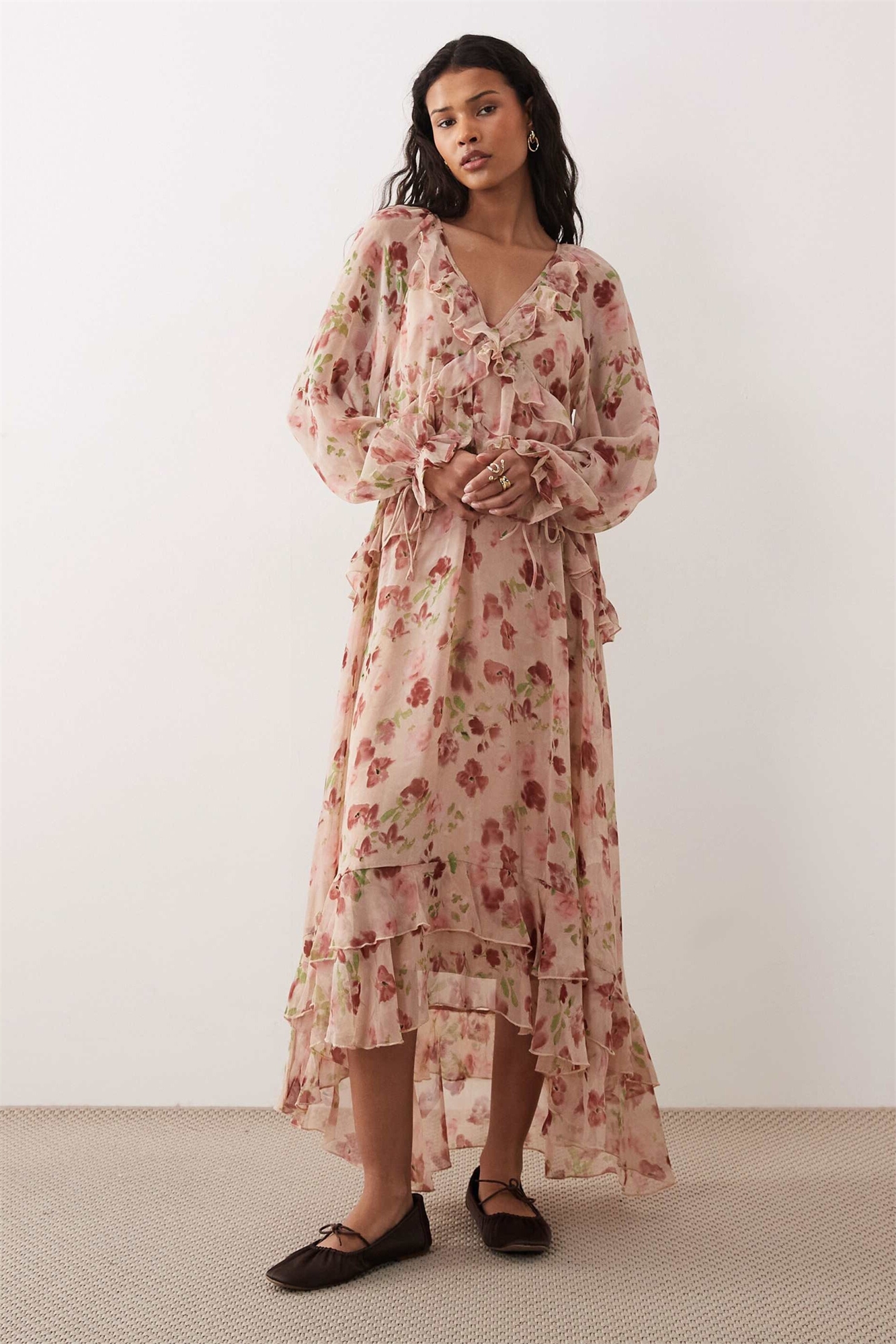 Платье-миди с длинными рукавами, летящим силуэтом и многослойным кроем