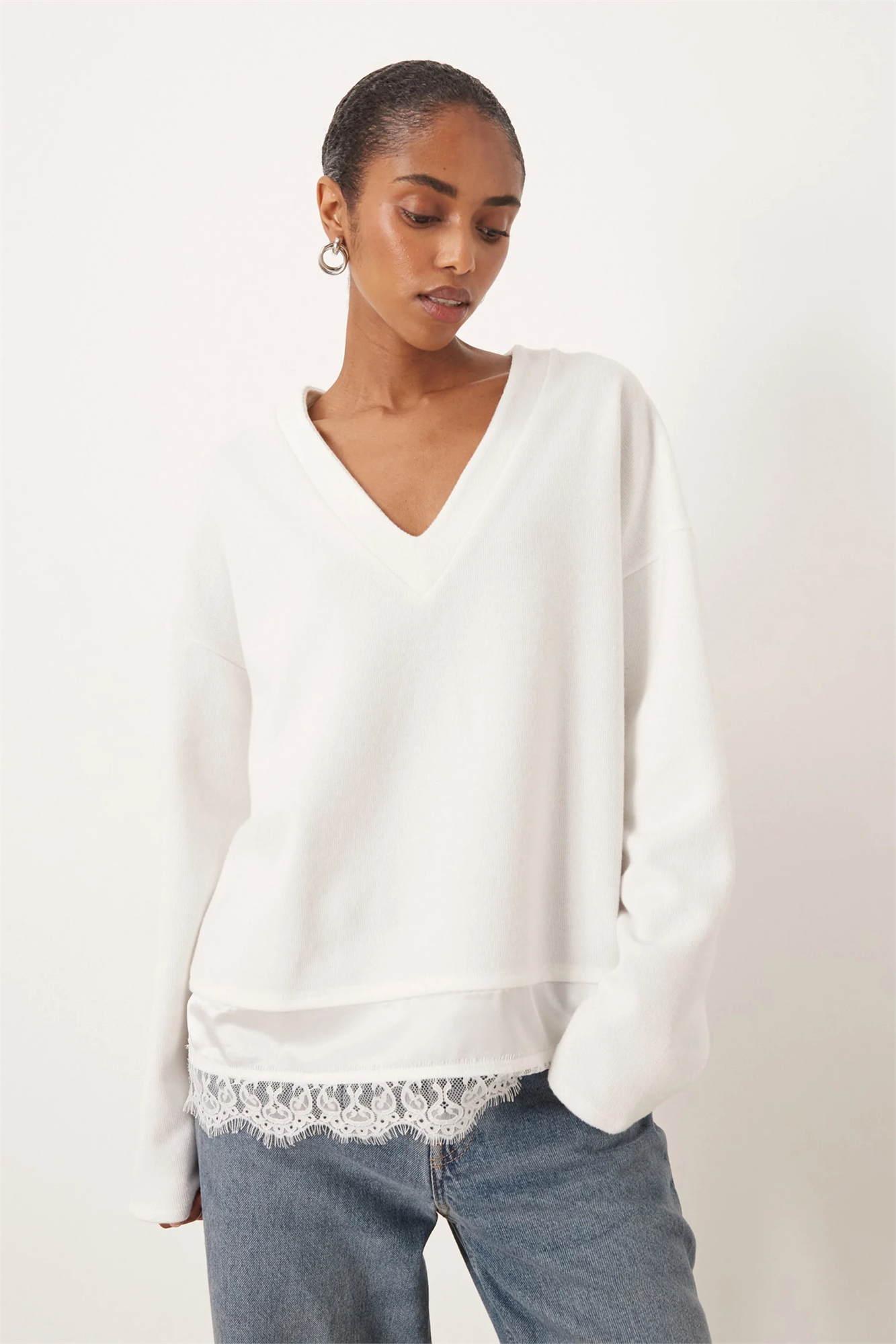 Свитшот с V-образным вырезом и кружевной вставкой