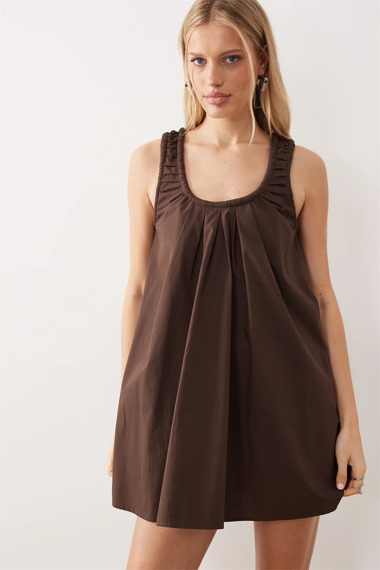 Мини-сарафан из поплина с вырезом «лодочка» и рюшами