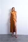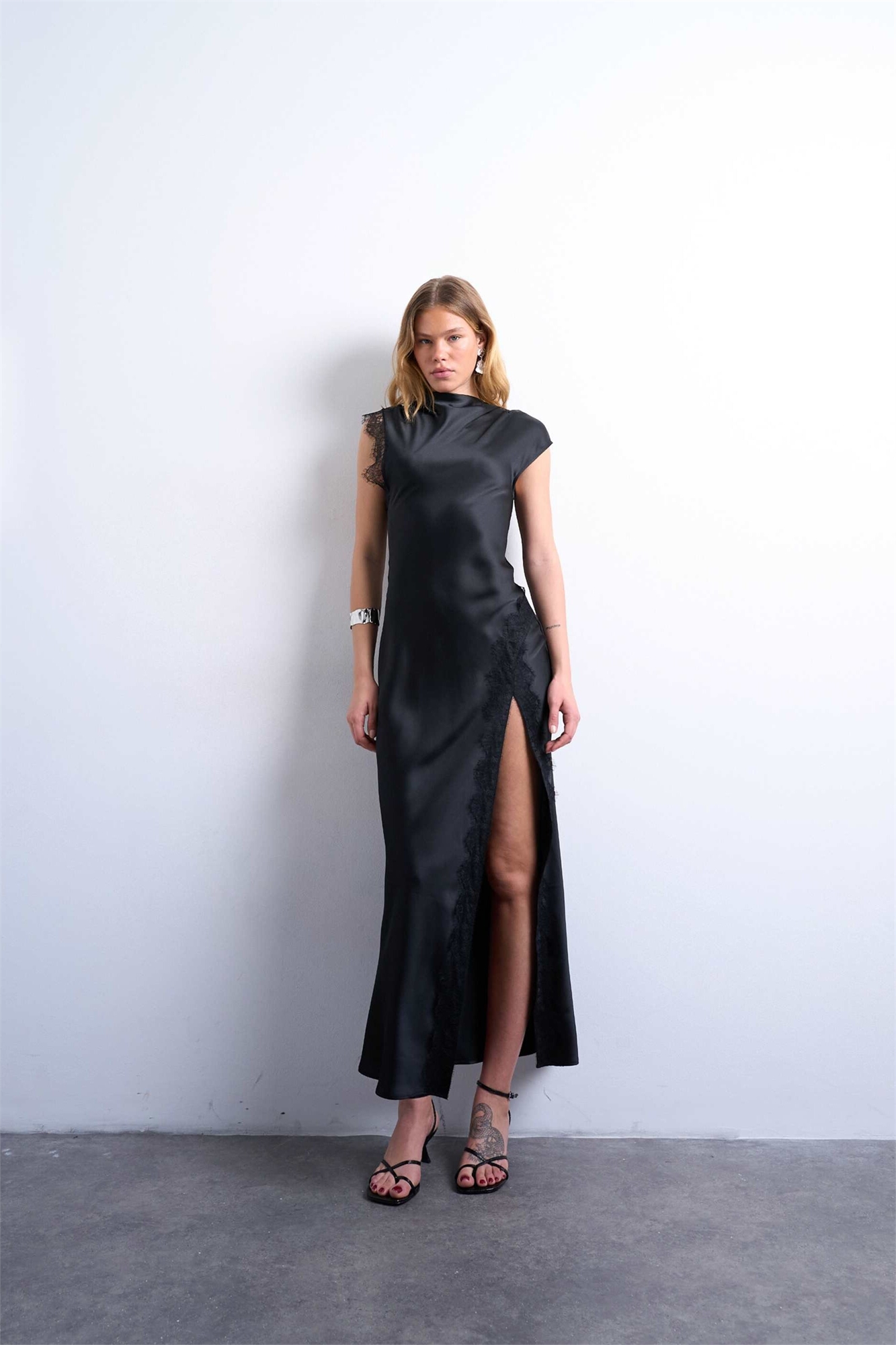 Макси-платье с атласным драпированным вырезом и кружевной отделкой