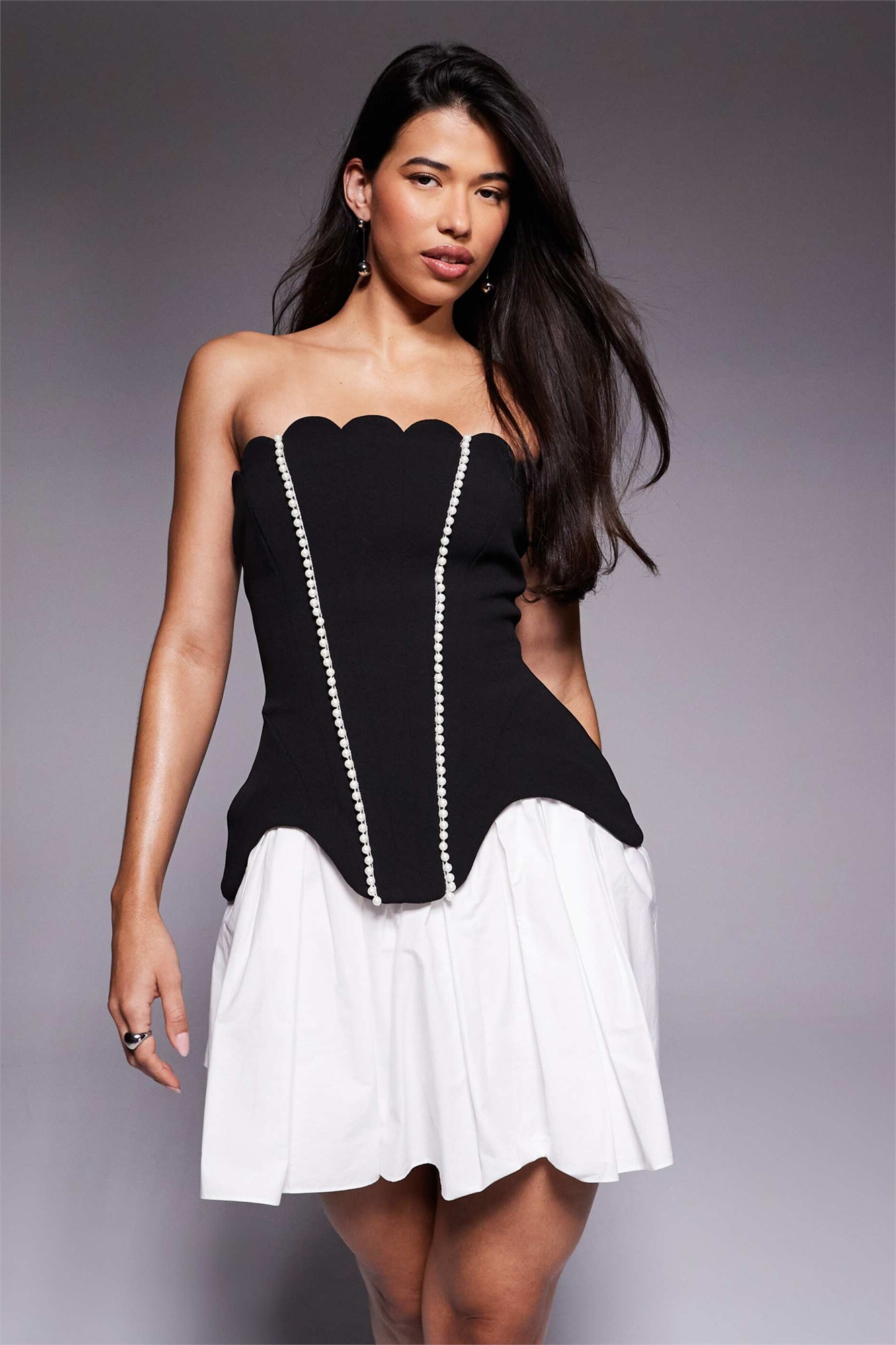 Мини-платье с волнистым подолом и юбкой из хлопкового поплина, украшенное жемчужной отделкой