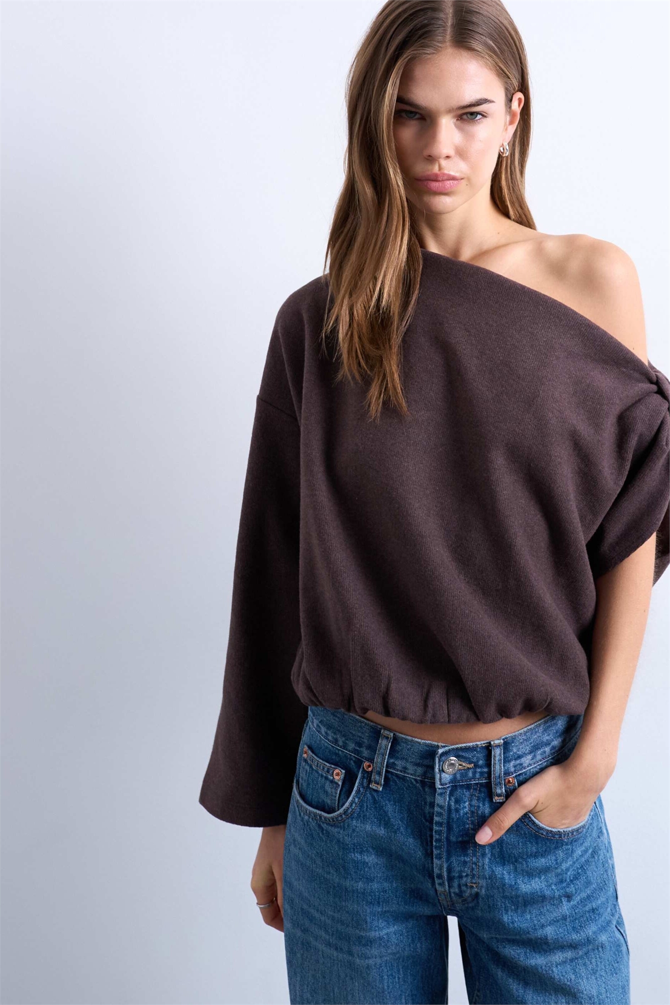 Топ с длинными рукавами, открытыми плечами и узелком на боку, с мягкой текстурой
