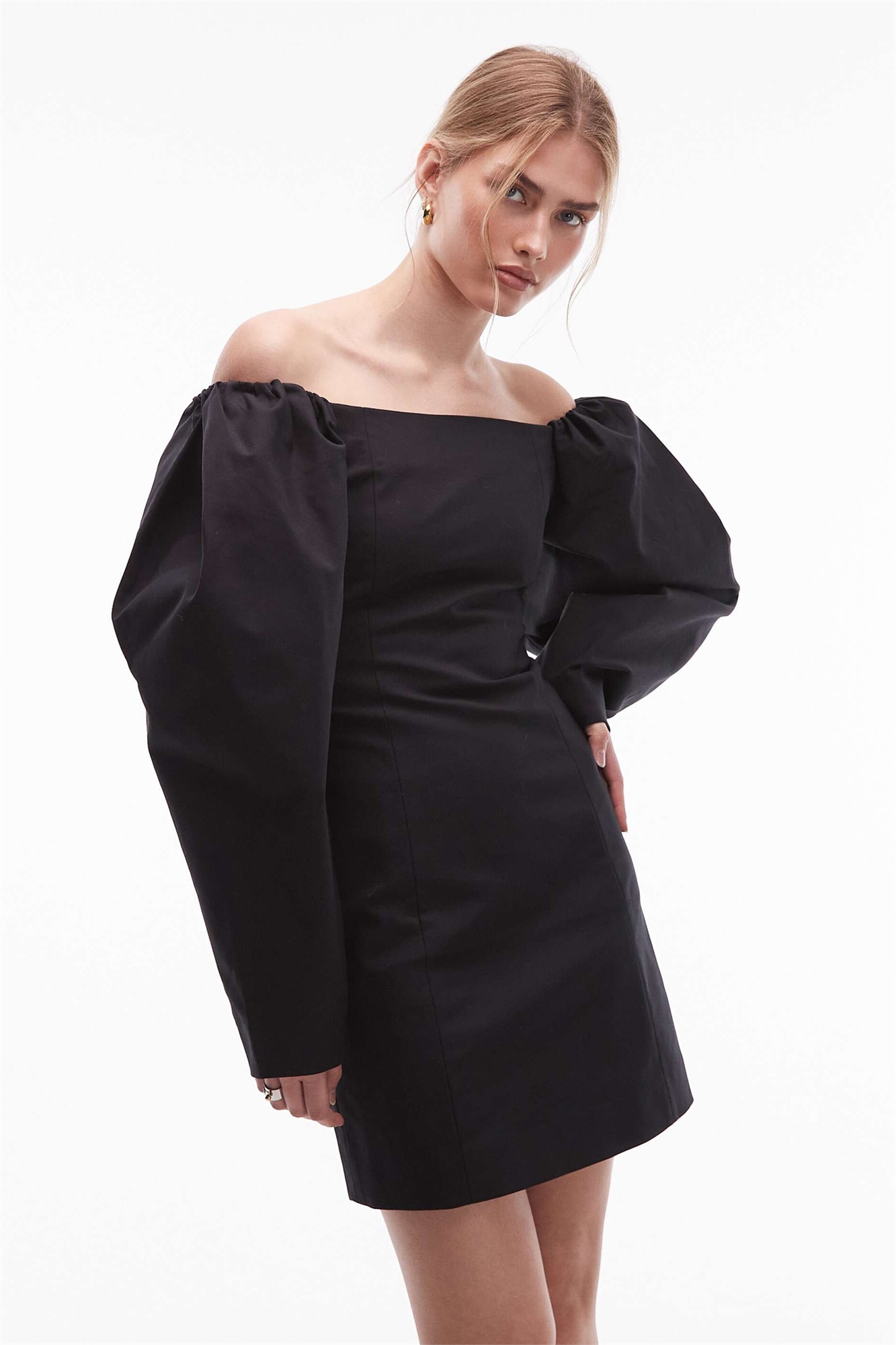 Объемное мини-платье с открытыми плечами и рукавами