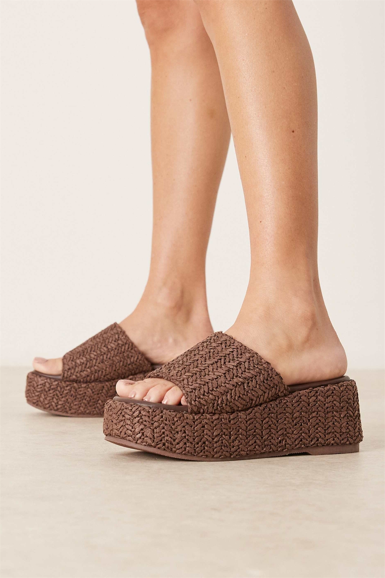 Верх из плетеной рафии. Подкладка: 50% полиуретан, 50% текстиль. Подошва: 100% поливинилхлорид. Верх: 100% рафия.