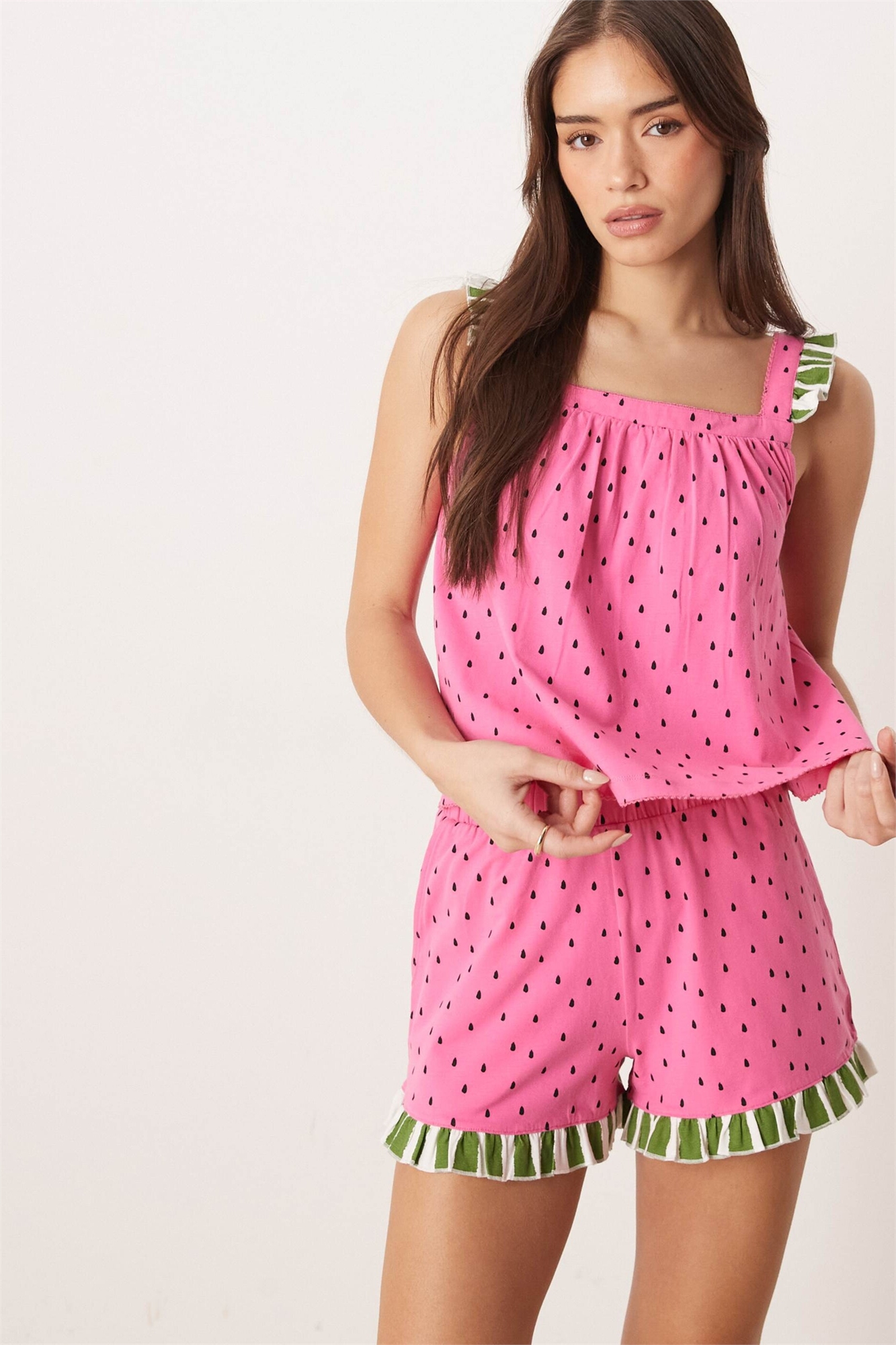 Комплект из жилета-свинг с оборками в горошек и коротких пижамных шорт