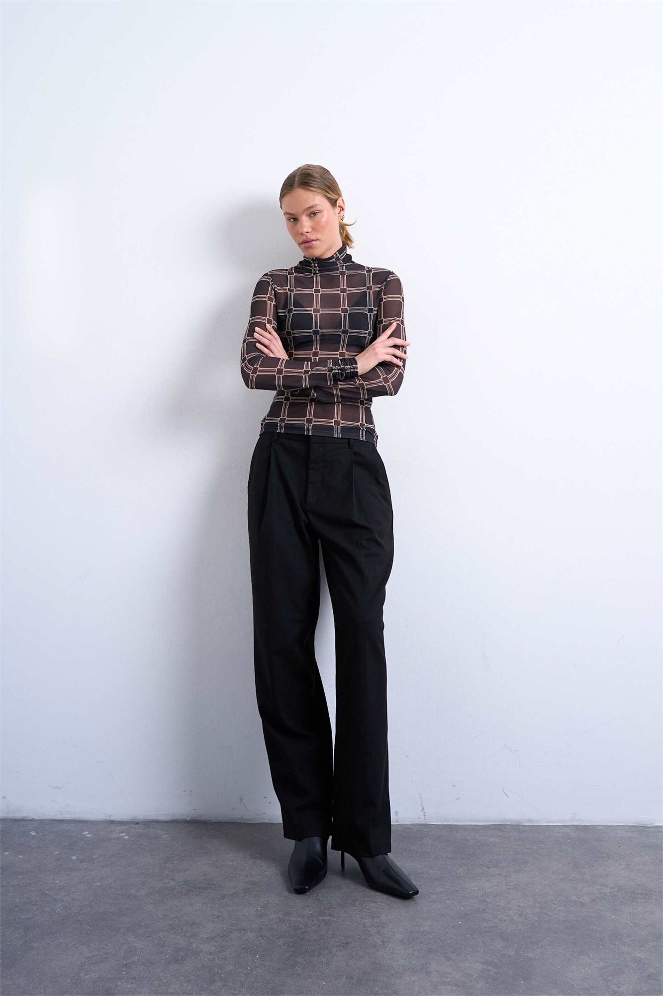 Топ с высоким воротником из сетчатой ткани с клетчатым принтом и длинными рукавами