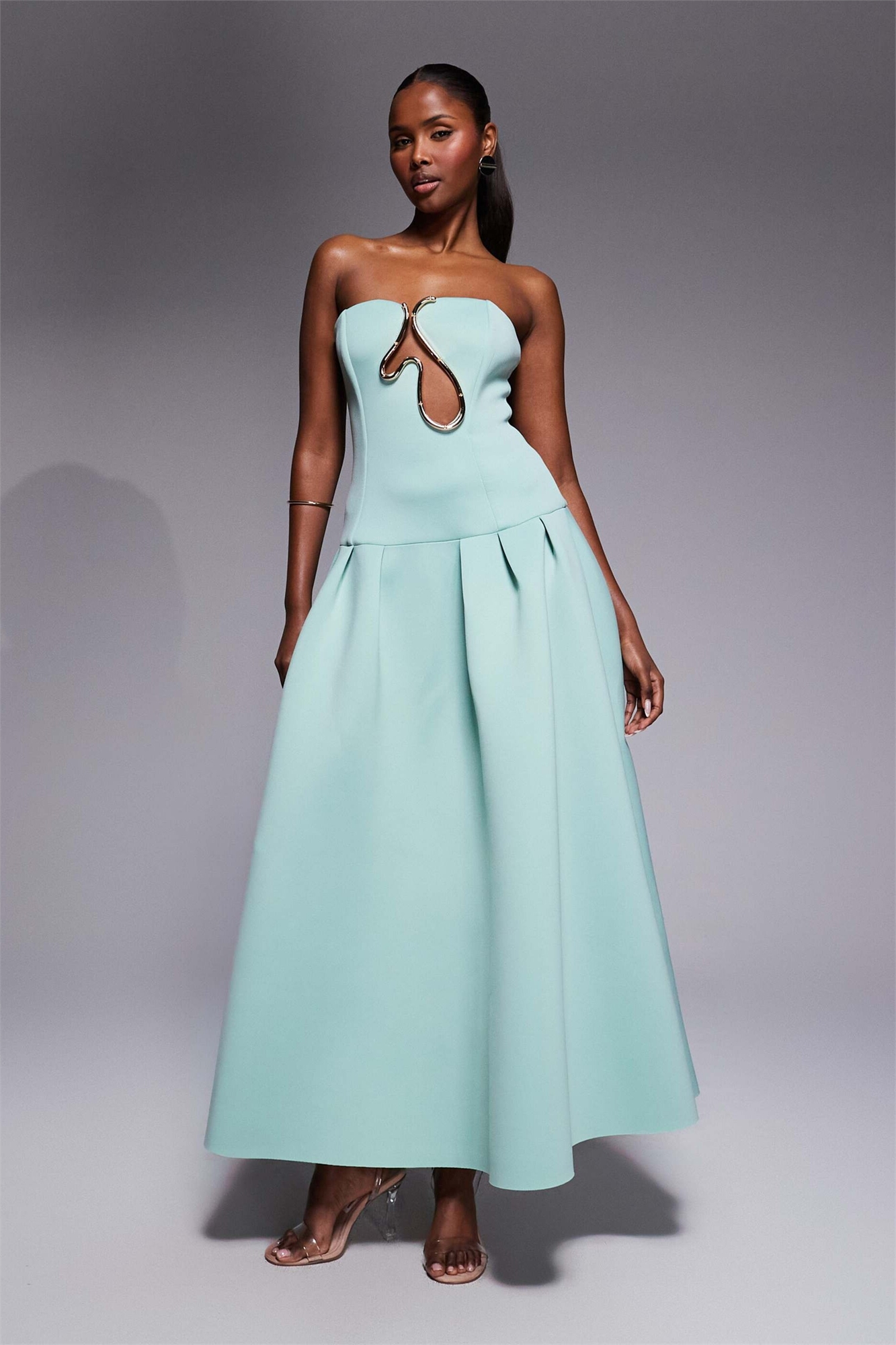 Макси-платье премиум-класса с заниженной талией и волнистой отделкой
