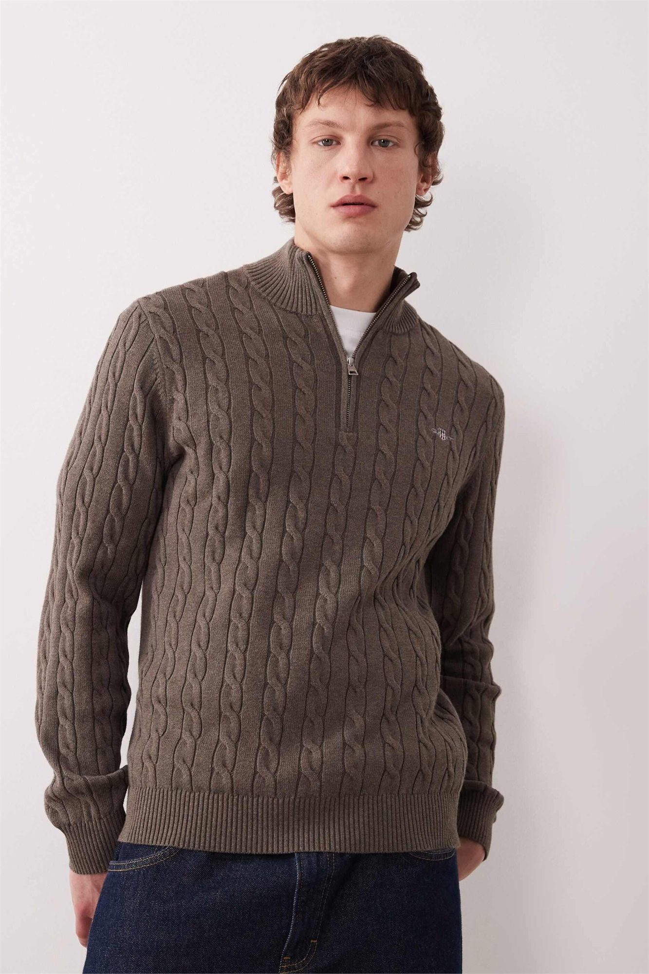 Хлопковый свитер с 3/4-й застежкой-молнией, коричневый, с узором «коса»