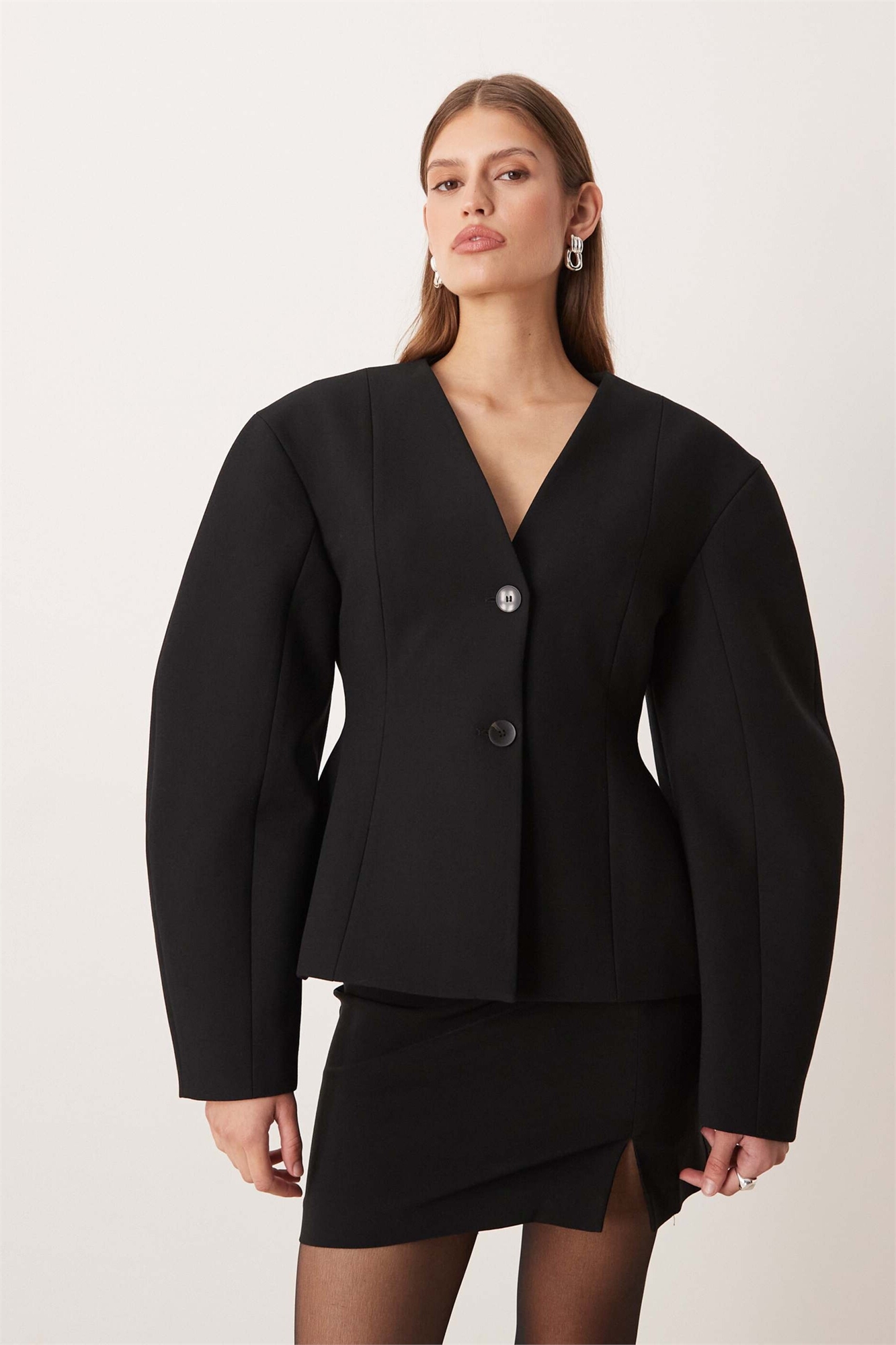 Приталенный жакет с коконом-рукавами и затягивающимся поясом, черный