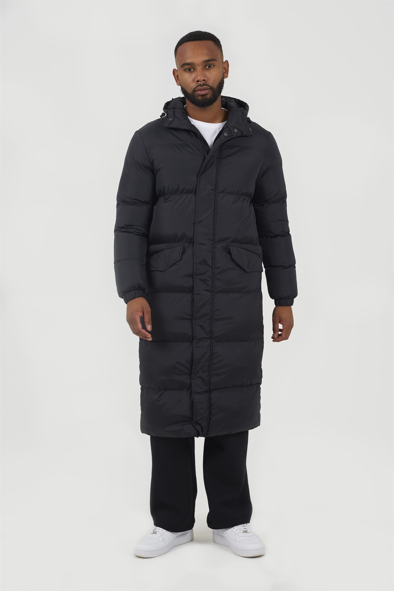 Длинное утепленное пуховое пальто с капюшоном черного цвета