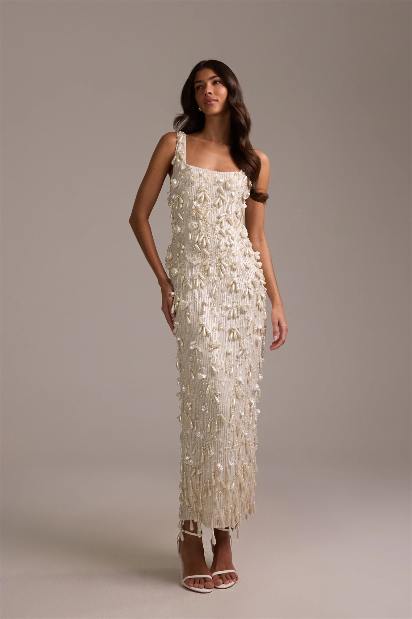 Макси-платье с квадратным вырезом, украшенное жемчугом, с бахромой из бисера