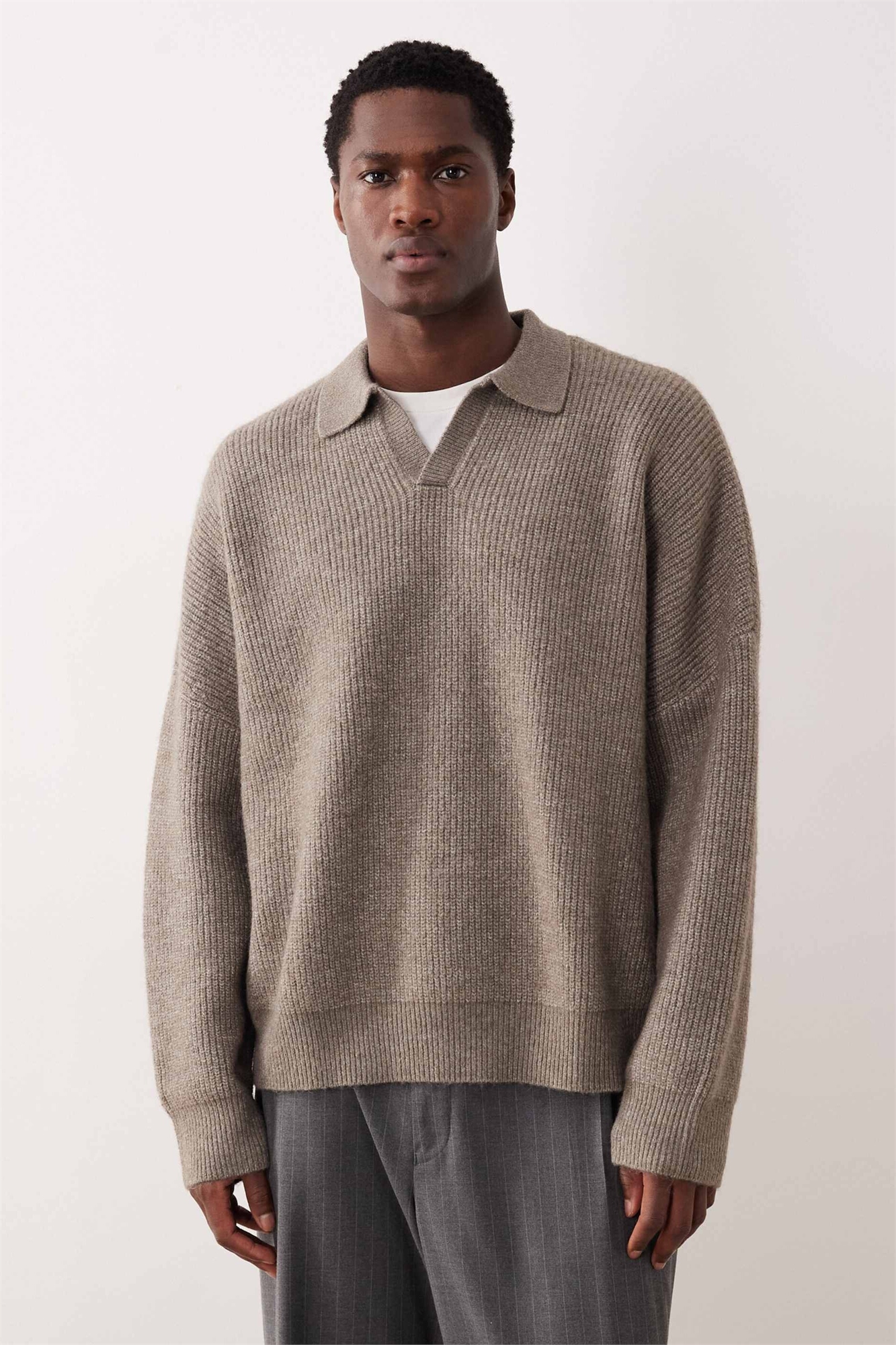 Свитер с вырезом на шее, выполненный в технике «рыбацкая резинка», с очень свободным кроем и прямоугольной формой