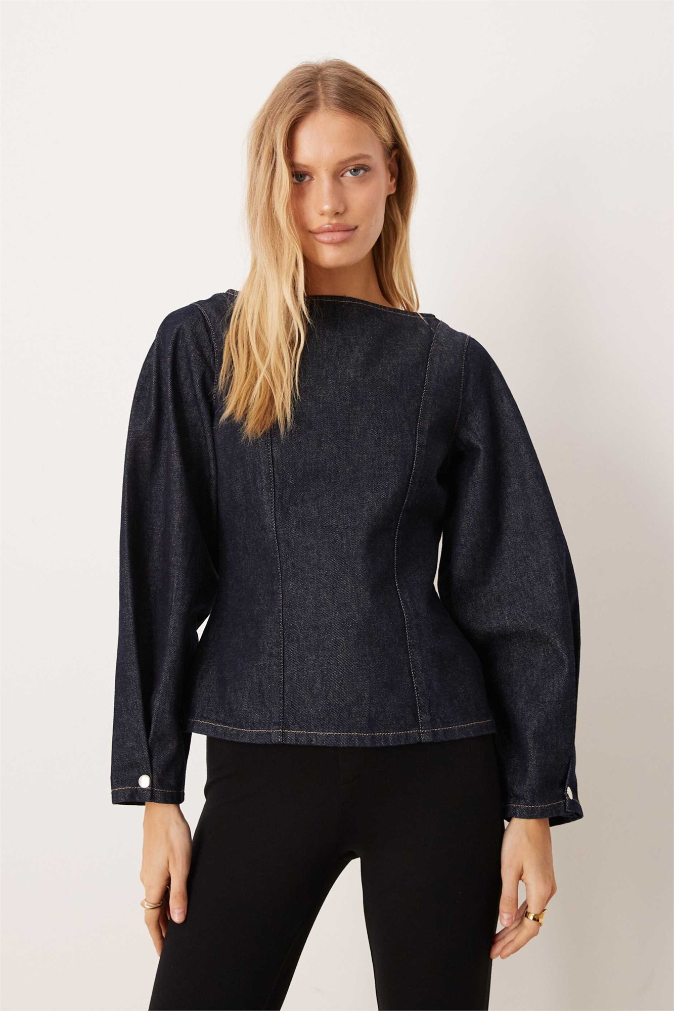 Джинсовая блузка с V-образным вырезом и рукавами-коконами