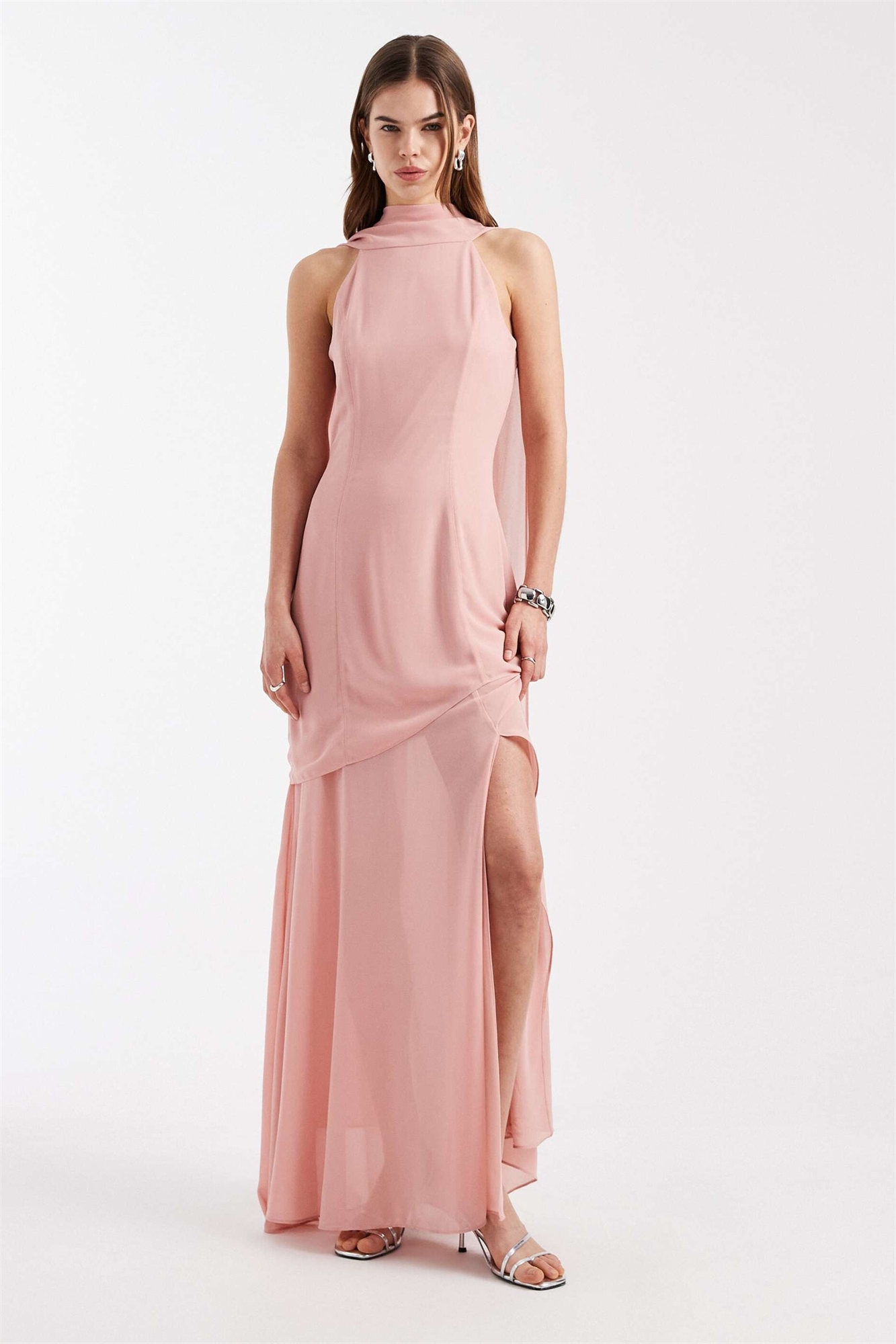 Макси-платье для подружки невесты из шифона с завязками за шеей и шарфом, с прозрачной юбкой