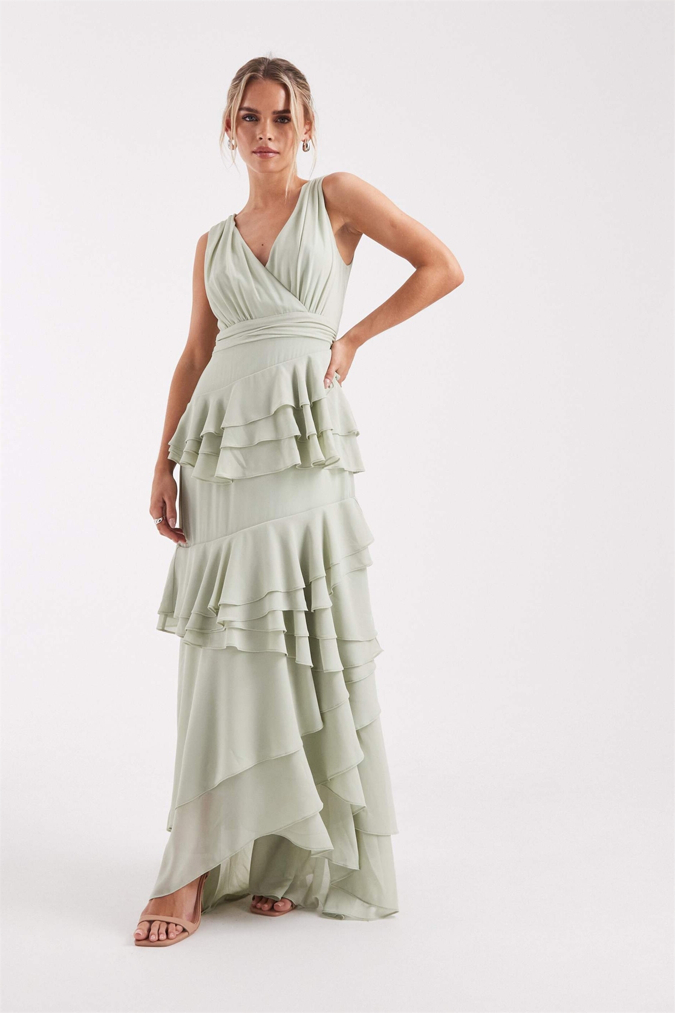 Макси-платье для подружки невесты из шифона с перекрещивающимся вырезом и многоярусными оборками