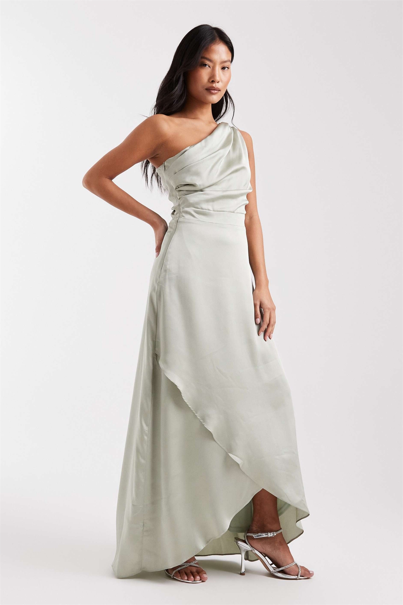 Макси-платье для подружки невесты из атласа с одним плечом и юбкой-парео