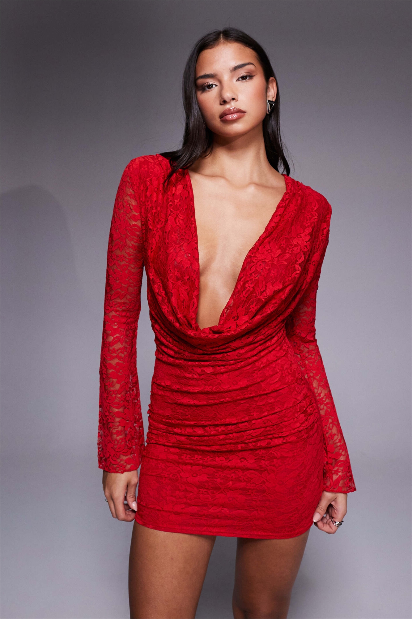 Эксклюзивное мини-платье облегающего кроя с кружевом, воротником-хомутом и расклешенными рукавами