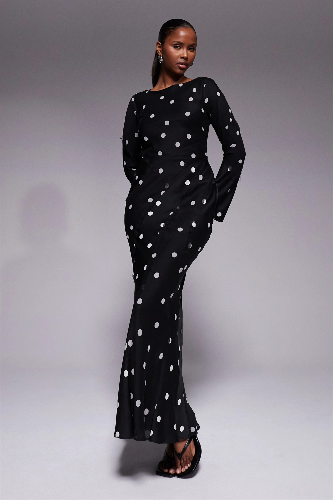 Макси-платье из атласа с V-образным вырезом и длинными рукавами, украшенное вставкой с необработанным краем