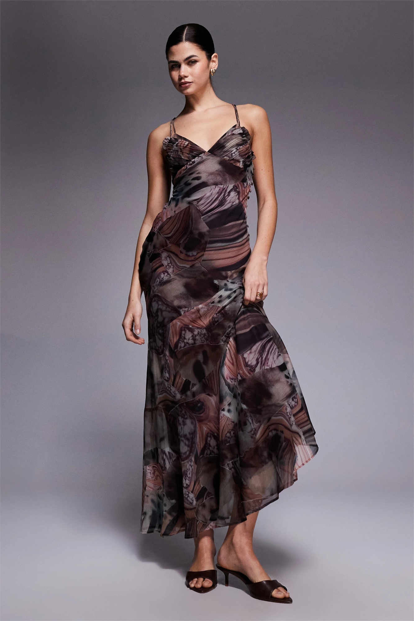 Платье «рыбий хвост» с косой кройкой и микро-двухслойной вставкой на груди