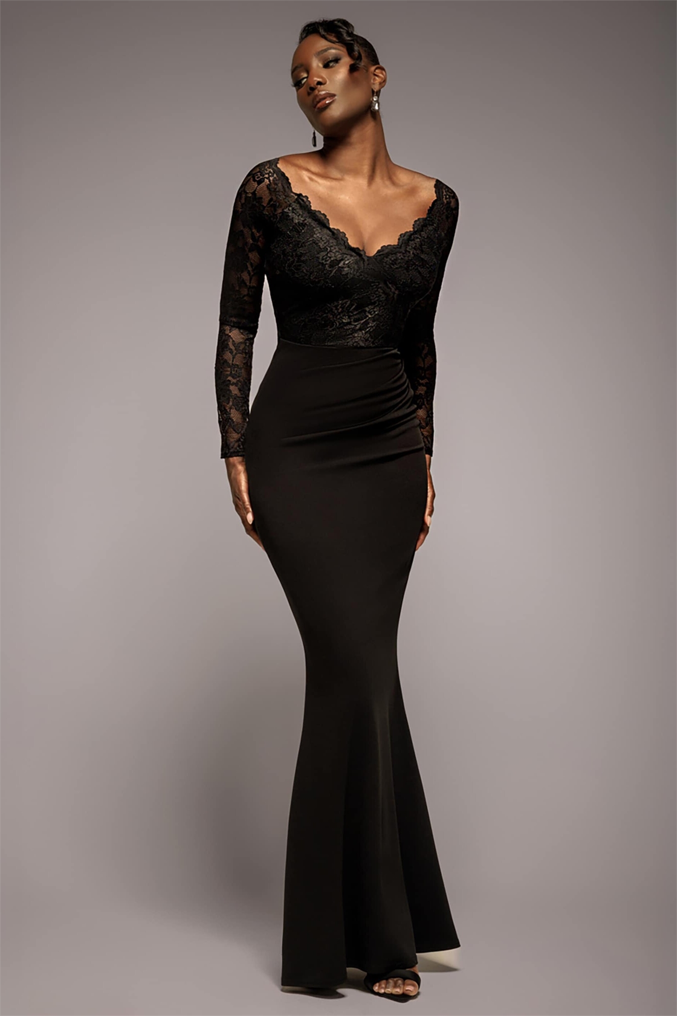 Макси-платье с длинными рукавами, лифом из кружева с волнистым краем и открытыми плечами