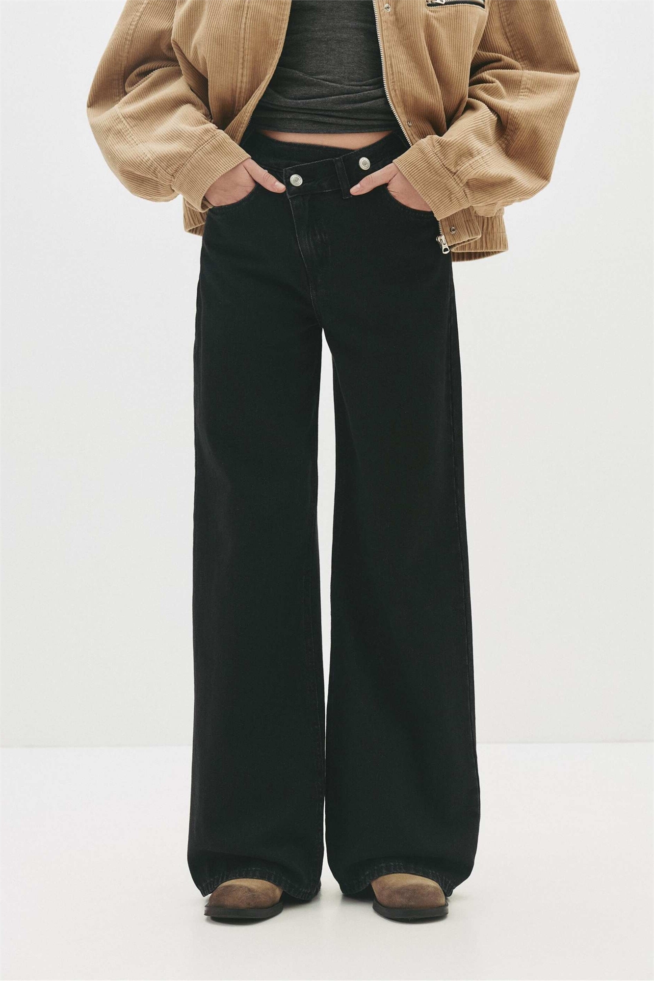 Джинсы с широкими брючинами и перекрещивающимся поясом