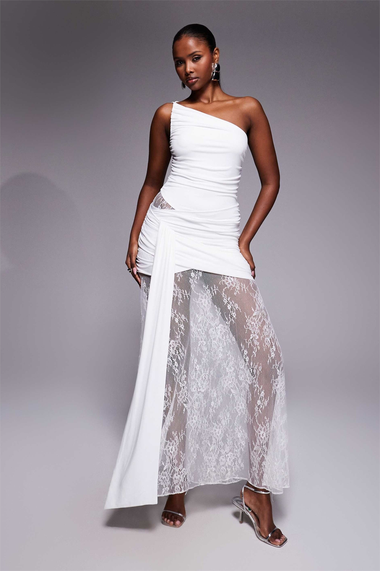 Свадебное макси-платье с одним плечом, рюшами и кружевным подолом