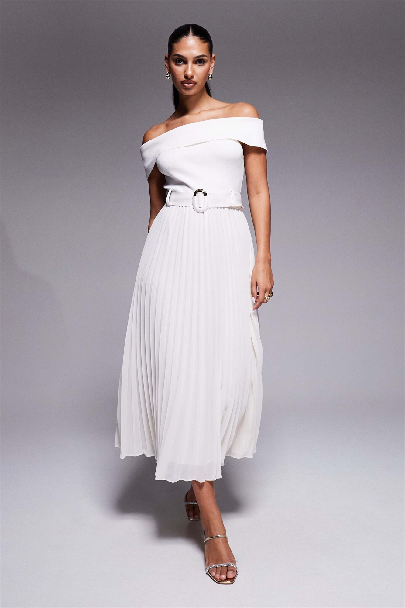Трикотажное платье средней длины с открытыми плечами и поясом