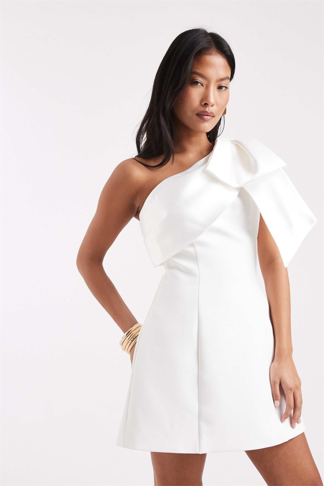 Свадебное мини-платье с одним плечом, объемным силуэтом и бантом