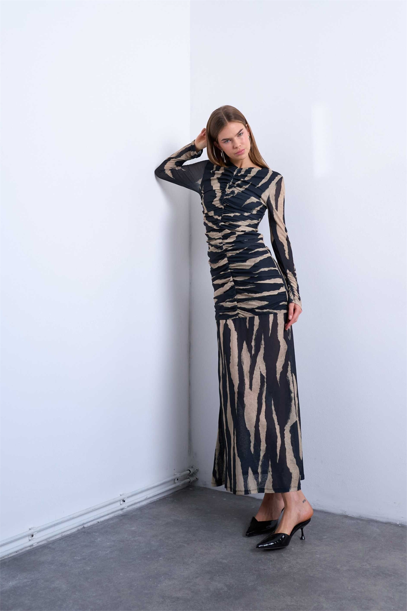Макси-платье с рюшами спереди и заниженной талией