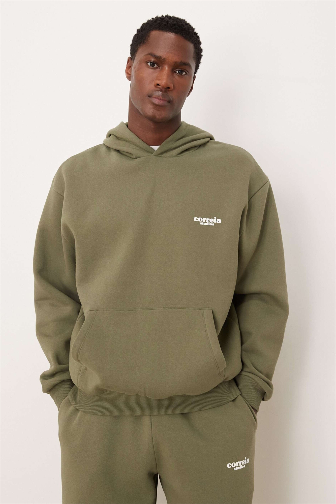 Свободная толстовка с капюшоном и принтом на груди цвета пыльного оливкового