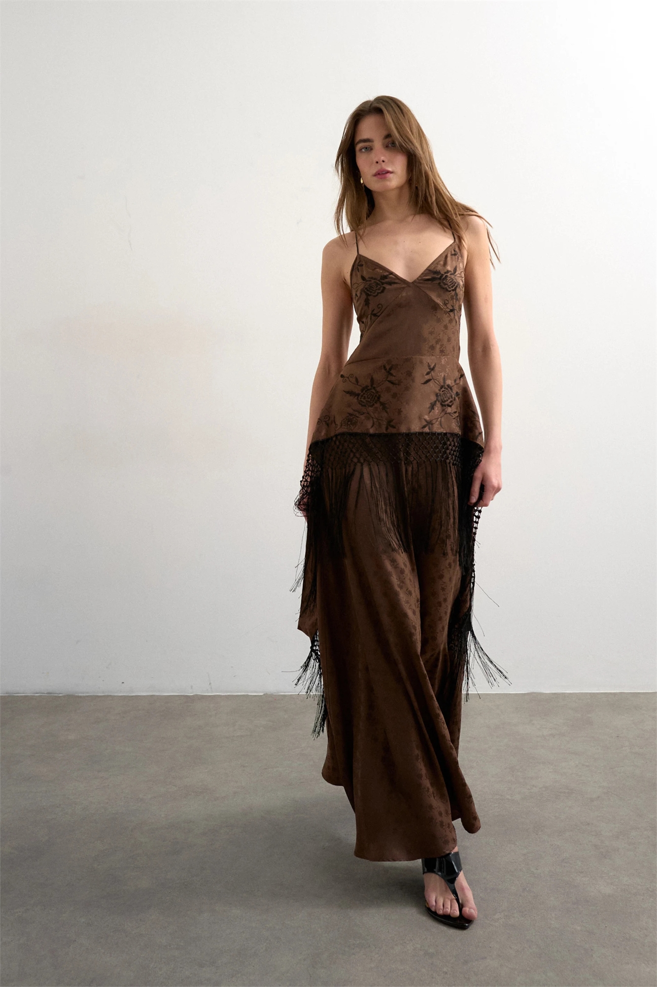 Атласное макси-платье на бретелях с жаккардовой вышивкой и бахромой