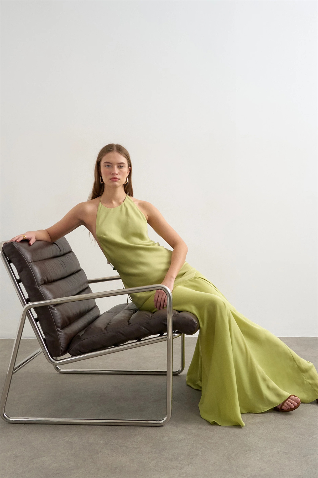Атласное макси-платье с завязками на шее и вышивкой бисером на спине