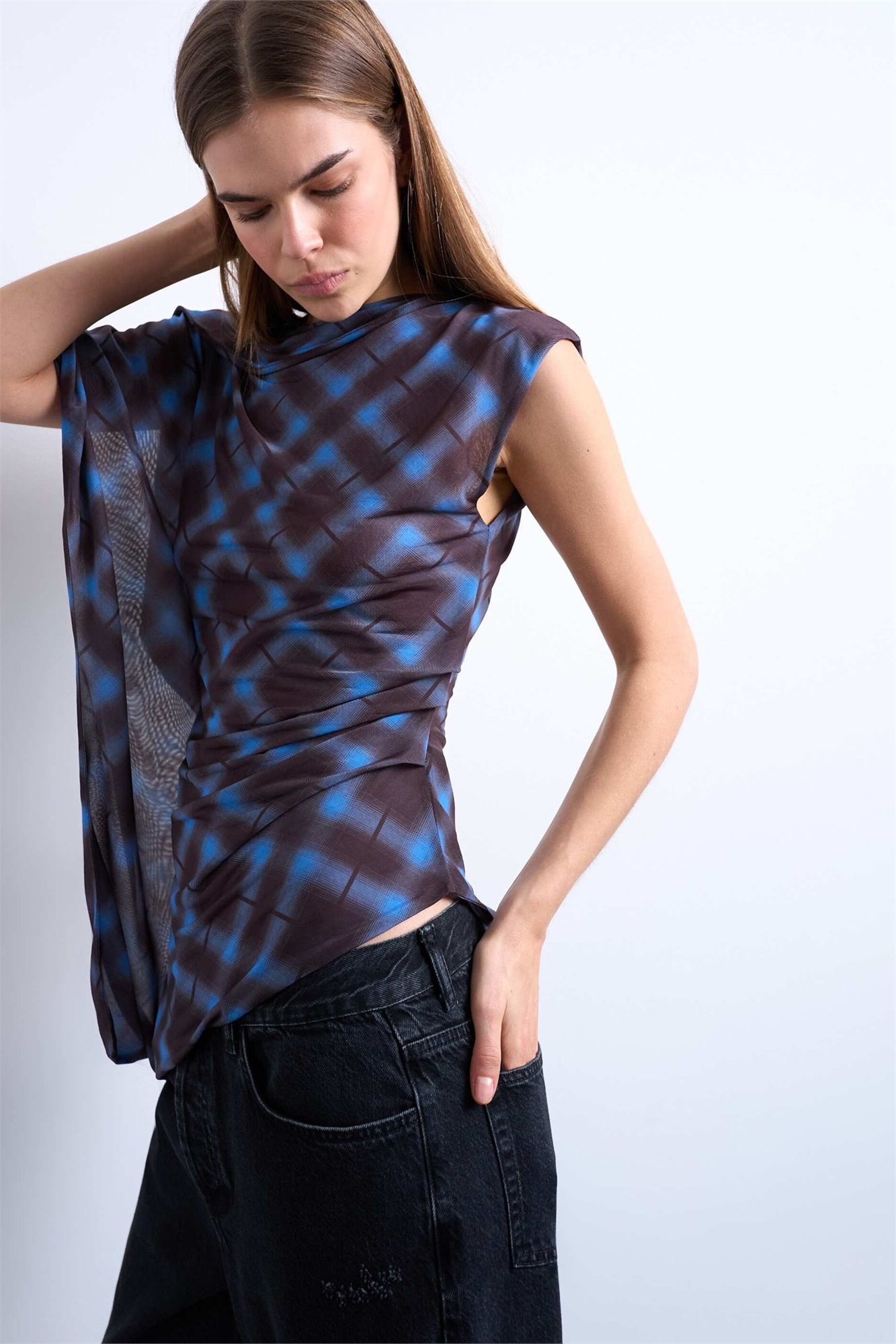 Топ с асимметричным рукавом и сетчатым узором
