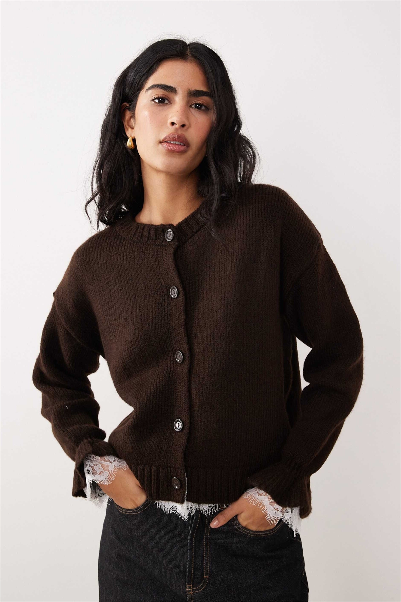 Вязаный кардиган с кружевными вставками и пуговицами