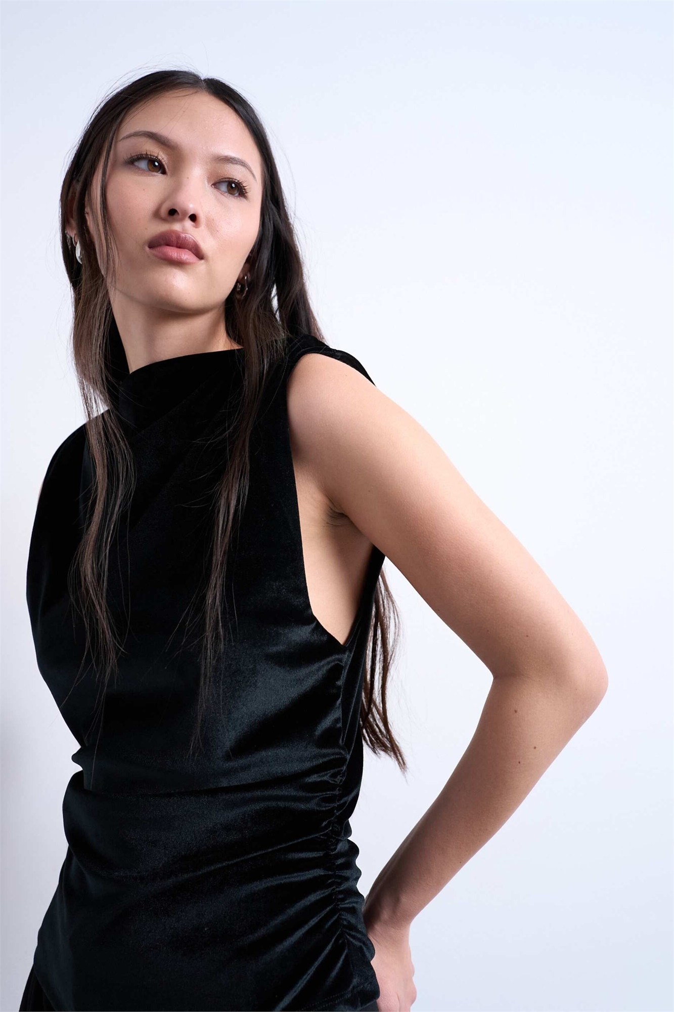 Топ с бархатными вставками, зауженными проймами и сборками по бокам