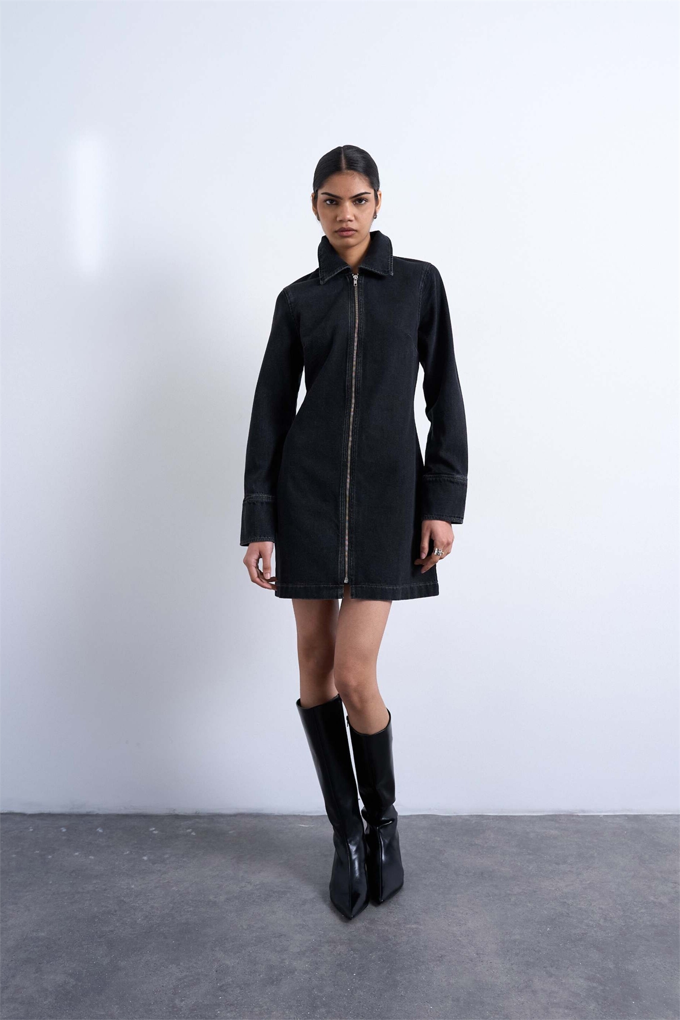 Мини-платье из денима с длинными рукавами и застежкой-молнией