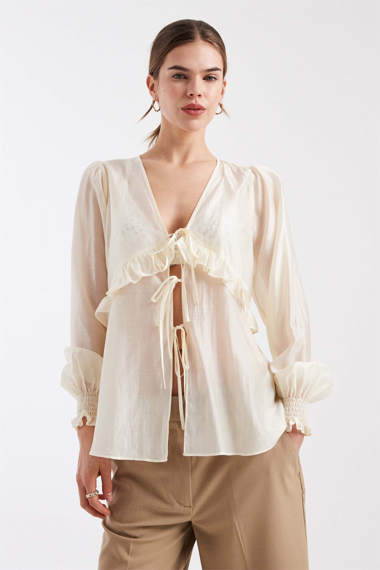 Блузка из полупрозрачного шифона с завязками, разрезом спереди и оборками