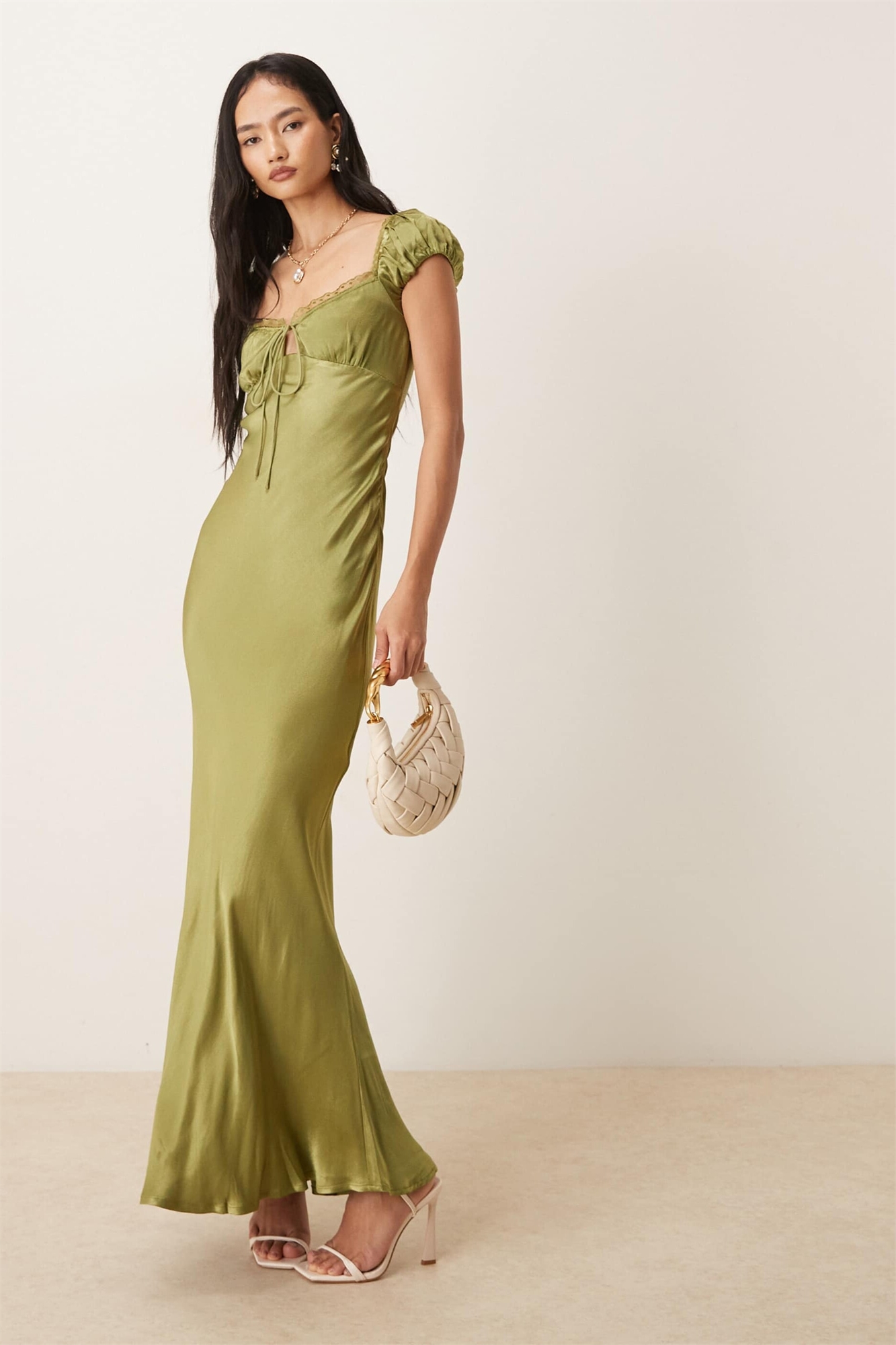 Макси-платье Stasia с атласными рукавами-буфами, кружевной отделкой и завязками спереди, оливкового цвета